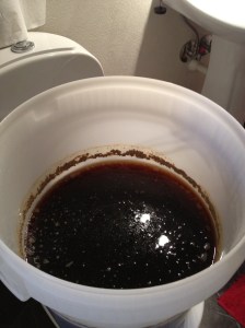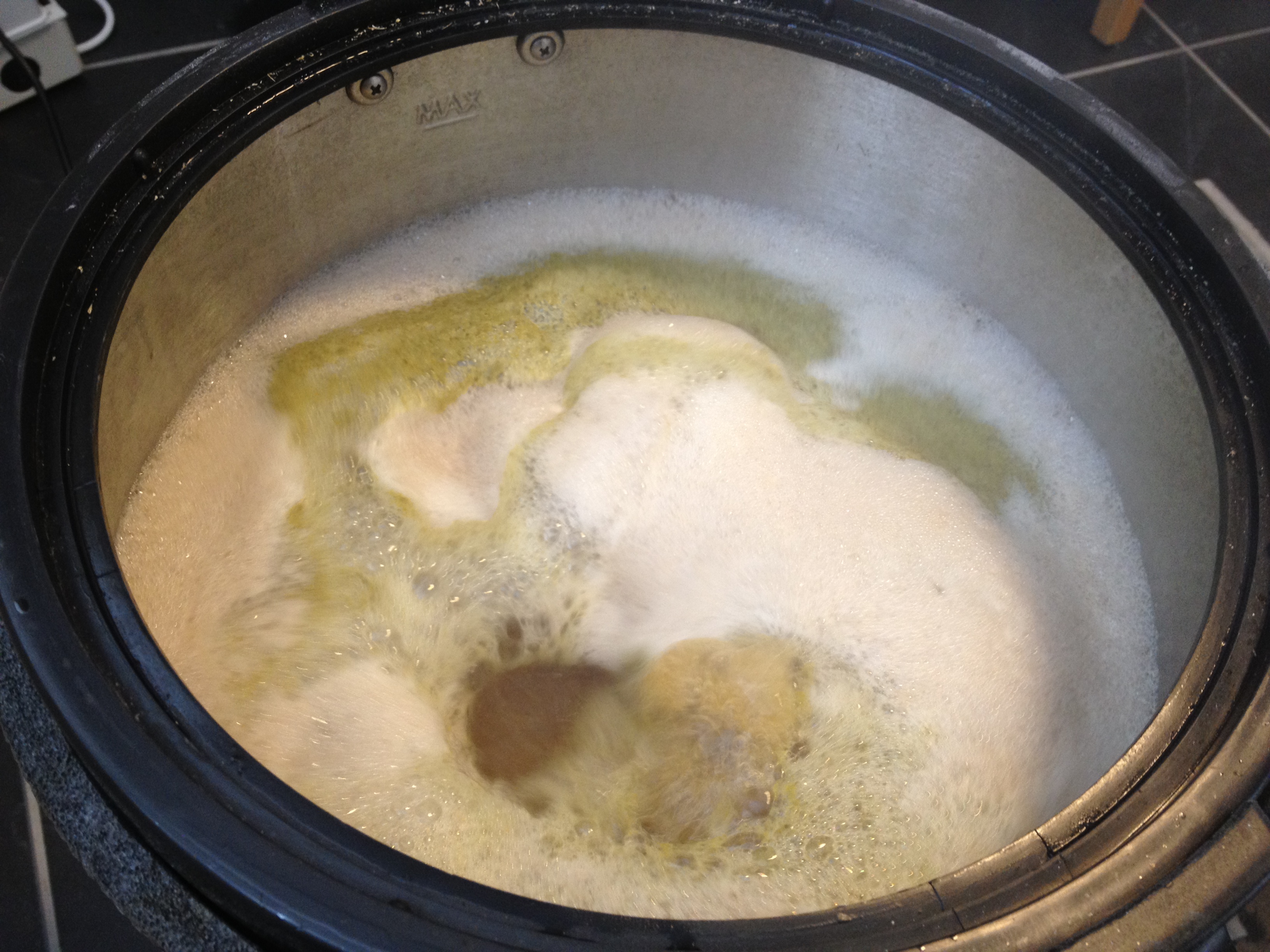ydeligvis har vi vært litt distrahert av prøvesmakingen denne dagen, da vi skulle demontere liggeunderlaget vi bruker som isolasjon rundt bryggekjelen oppdaget vi at vi har nok rotet litt mye underveis, vørteren har kommet mellom liggeunderlaget og kjelen før koking, noe som medførte at det har limt seg godt fast i kjelen…