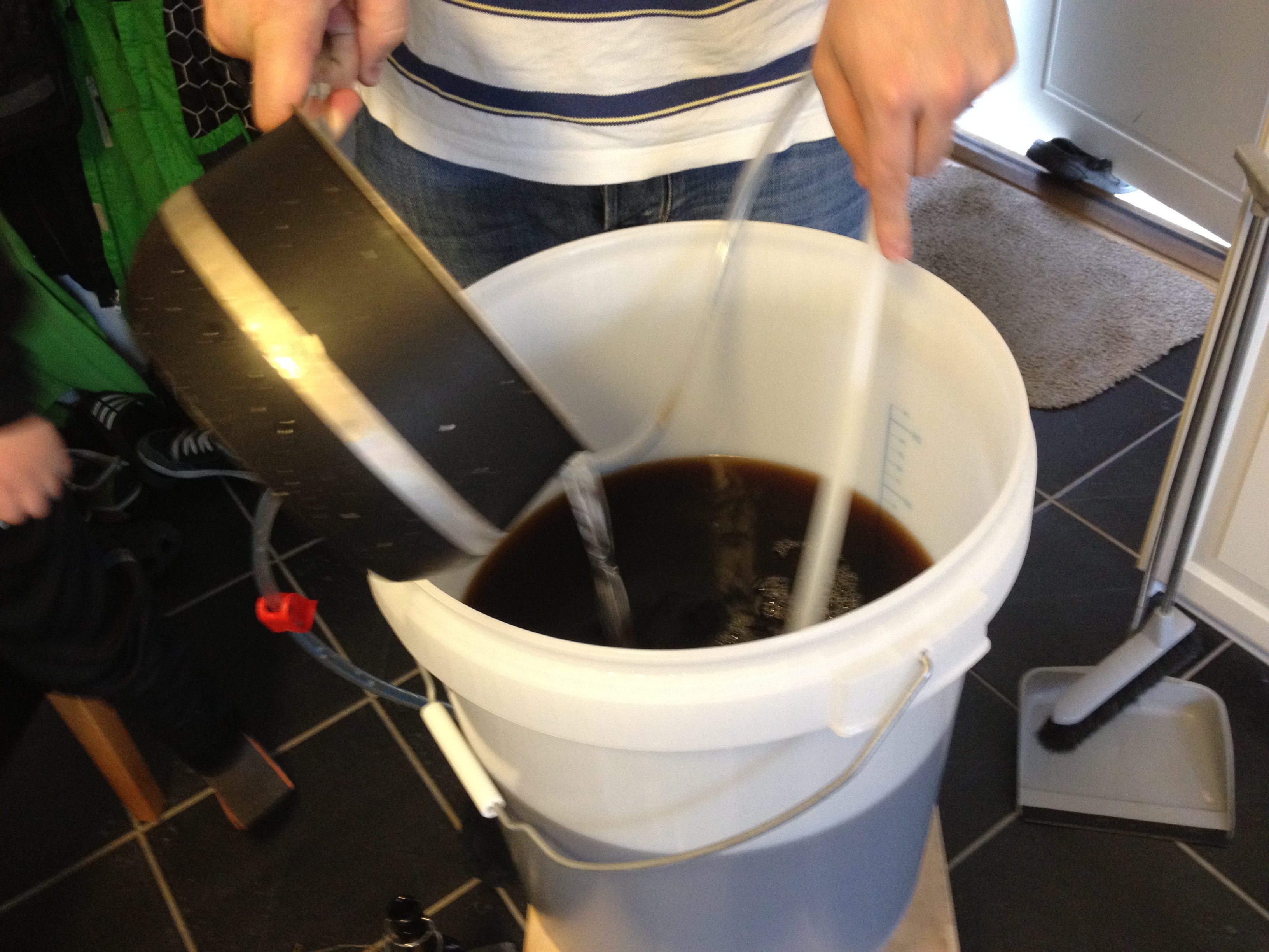 Til slutt kan vi sette drøye 20 liter til gjæring, Målt OG er 1049, noe som er litt under det vi burde hatt (1053) etter oppskrifta. Vi har vært litt misfornøyd med effektivitet og gjæringsmengde på de tidligere bryggene, så kanskje vi har vært litt ivrige idag når vi tilsatte vann før kokinga. Idag bruker vi tørrgjær (Us05), noe vi ikke har gjort før. Men det fungerer sikkert det også.