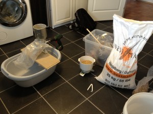 Etter å ha gravd litt rundt i pakkene fra bryggselv.no har vi funnet frem ingrediensene og er klar for brygging. Også denne gangen knuser vi kornet selv. Dette ledet til en diskusjon om hvorvidt knusingen vår (for mye knust?) kan være en årsak til litt dårlig effektivtet (60-65%) i de siste bryggene våre. Ingen konklusjon ble nådd, så tilbakemeldinger her mottas gjerne.