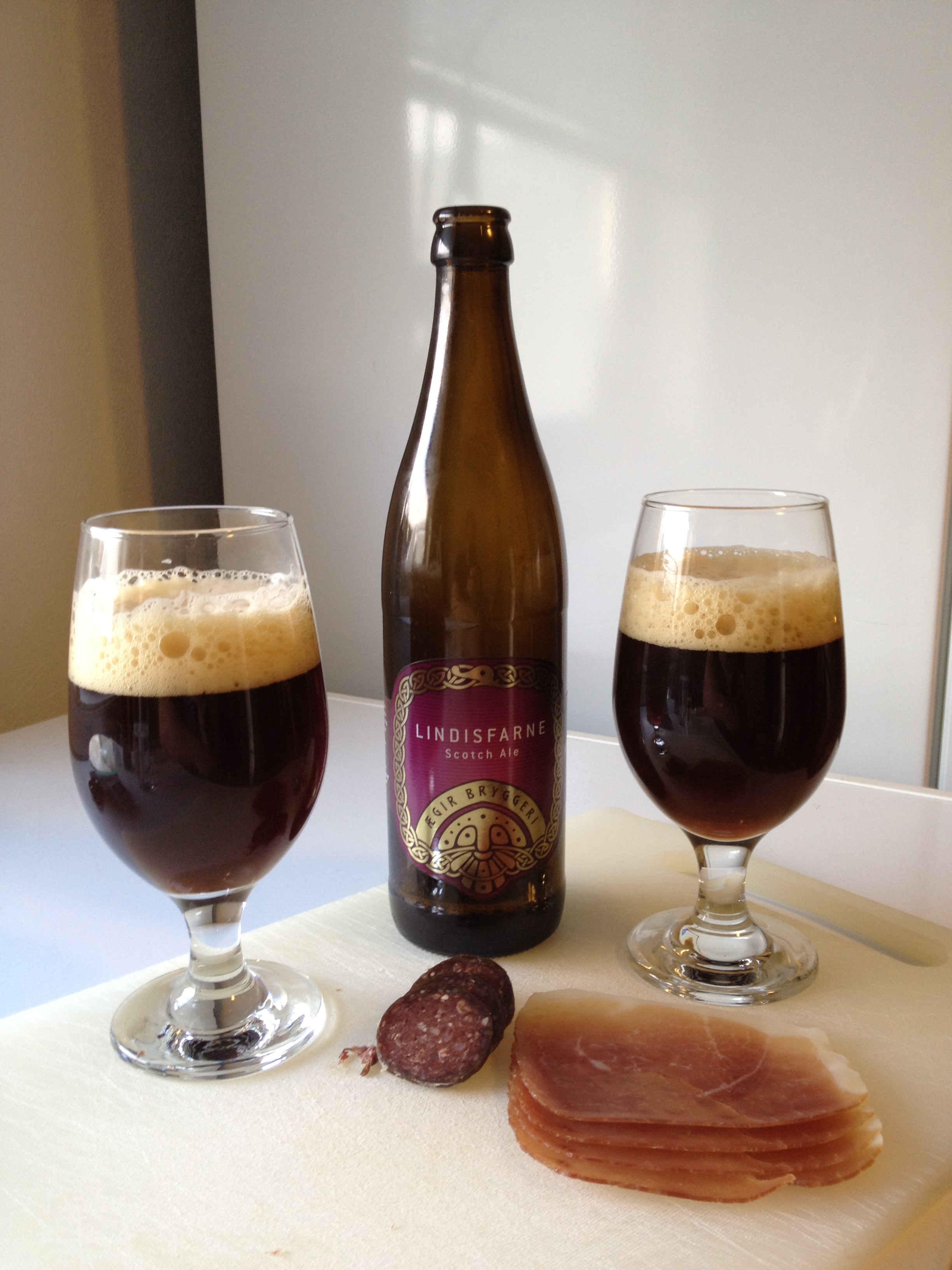 Til kjølingen har vi et norsk skotsk øl. Lindisfarne Scotch Ale fra Ægir bryggeri (7%). Dette ølet skal visstnok passe godt til kjøttretter og røykt spekemat, så mens fru Bryggerisjef var ute så raidet vi kjøleskapet. Jada, utvalget ser ganske stusselig ut på bildet, men det var fordi vi ikke klarte å vente helt til 3. øla med å begynne på saltmaten. I denne alen er det brukt peated malt, og røykpreget kjennes både på lukt og ettersmak. Den er mørk, fyldig, søtlig og røyksmaken sitter lenge. God, men såpass spesiell at ei flaske er nok tilstrekkelig på en kveld.