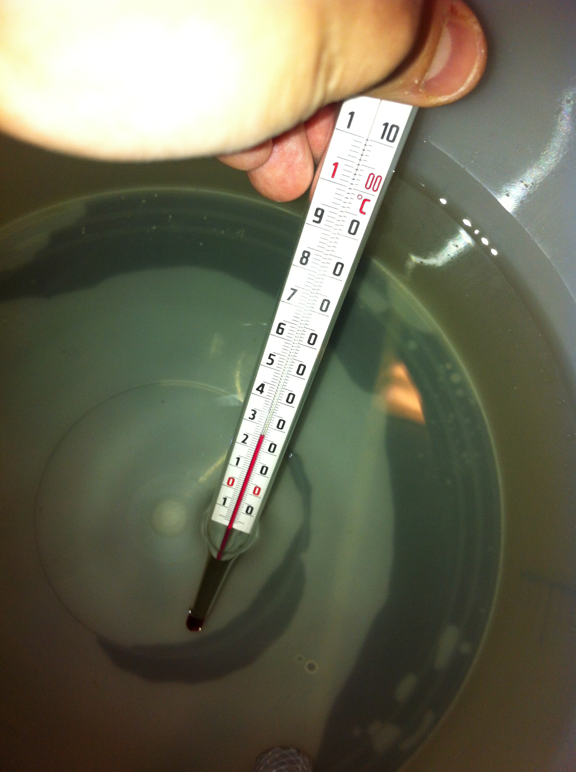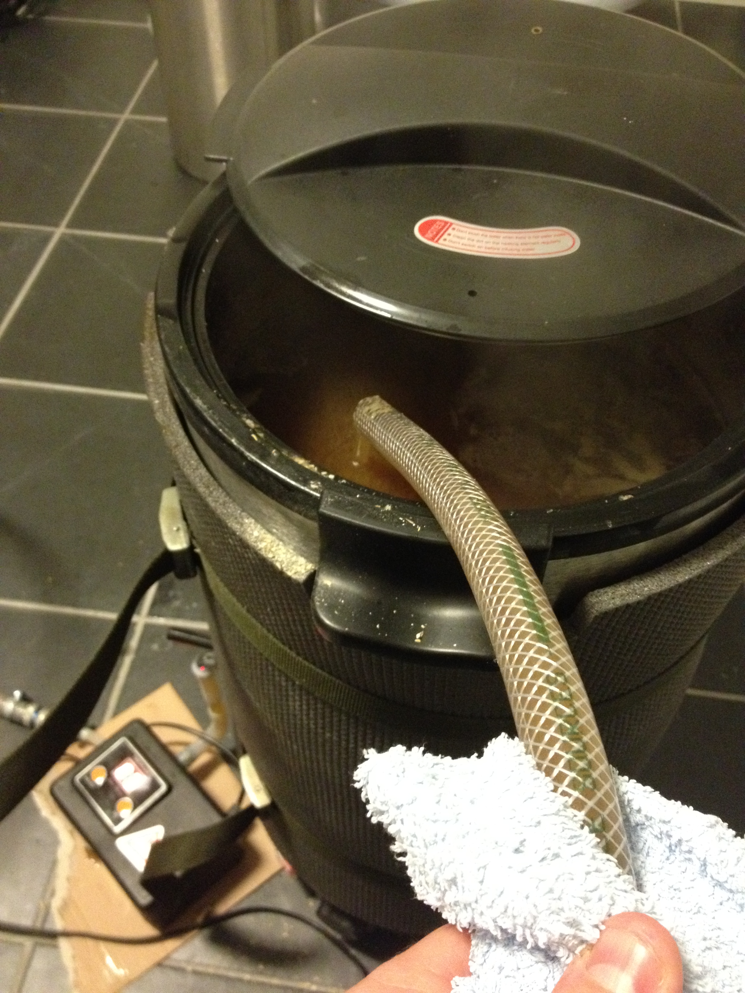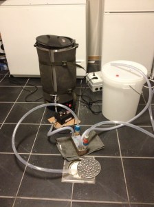 Endelig kjøletid! Vi sirkulerer kokende vørter gjennom systemet noen minutter for å kverke eventuelle ulumskheter som måtte ha sneket seg unna rengjøringen i forkant. Så setter vi på kaldt kjølevann gjennom platekjøleren og tapper i gjæringsbøtta. Når vi har full flow fra kokekaret gjennom pumpa ligger vi på rundt 30 grader på vørteren som kommer gjennom, så vi reduserer gjennomstrømmingen litt slik at vi heller nærmer oss 20 grader. Da tar det noen minutter ekstra, men til slutt sitter vi igjen med 24,5 liter nedkjølt og tappet over, og det tok under 10 minutter. Det er absolutt godkjent.