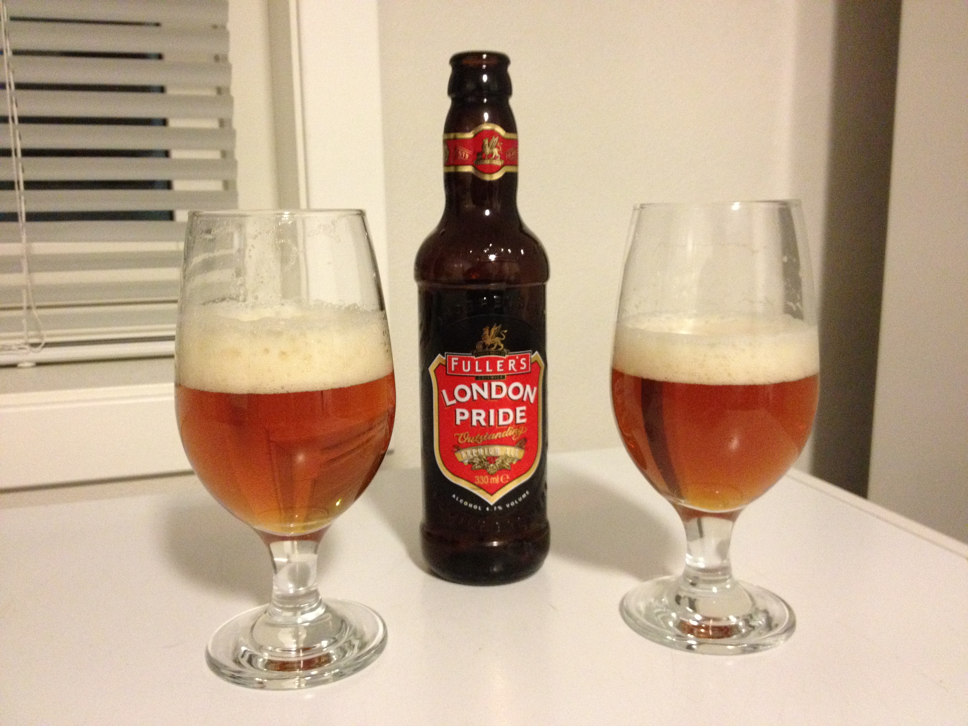 Vi fant også et annet Fullersøl i butikkhyllene for ikke lenge siden, Fullers London Pride. Dette ølet har du kanskje sett på tap om du er på en engelsk pub. Det er et typisk lettdrukket pubøl, fin maltsmak i bunn, noe karamellsødme, og ikke så mye humlepreg. Etter å ha smakt ESBen så synes vi denne blir litt for tynn, smaker nesten utvannet. Frisk, har fin kullsyremengde og har ingen usmaker.