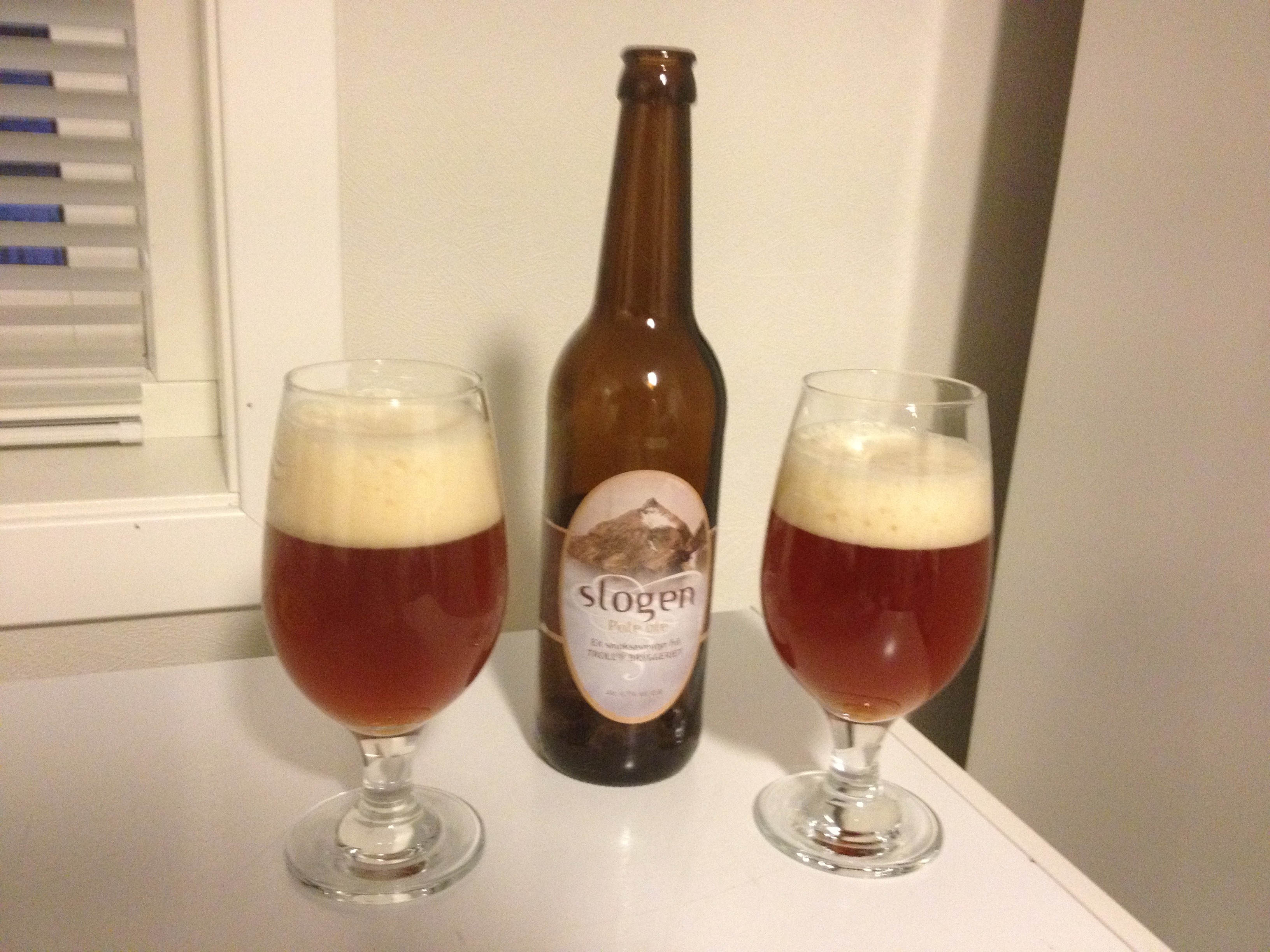 Meskevannet har enda ikke fått riktig temperatur, så benytter vi sjansen til å ta en kjapp middag, og til maten tar vi oss en Slogen Pale Ale fra Trollbryggeriet. Den er ganske mørk på farge for å være en pale ale. Det er også en anelse brent/røstet i smaken. God fylde og godt balansert humlepreg. Passer ganske godt til mat egentlig.