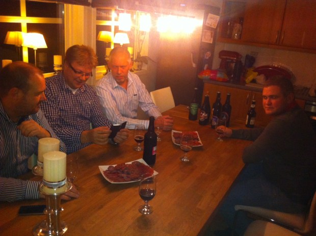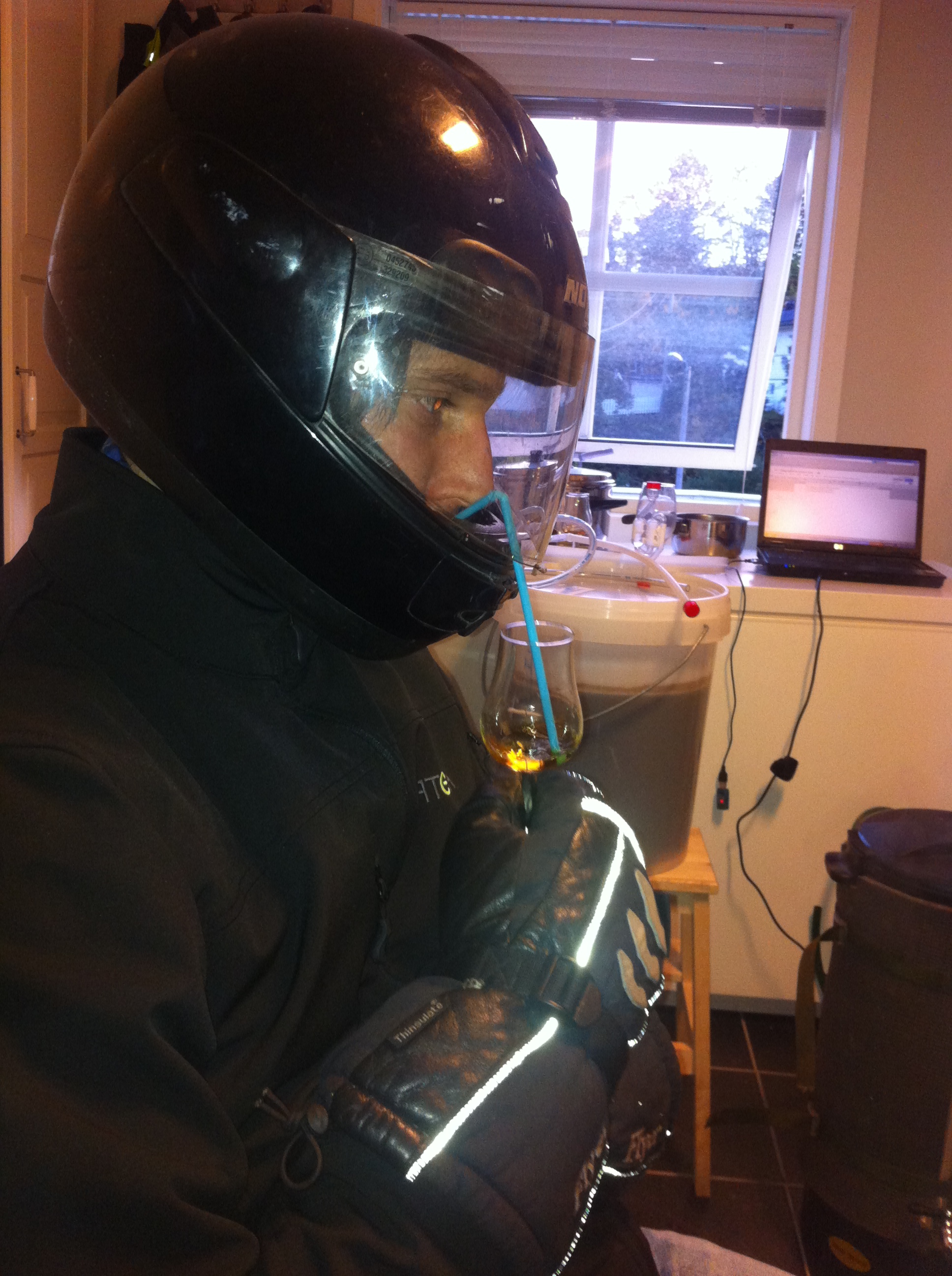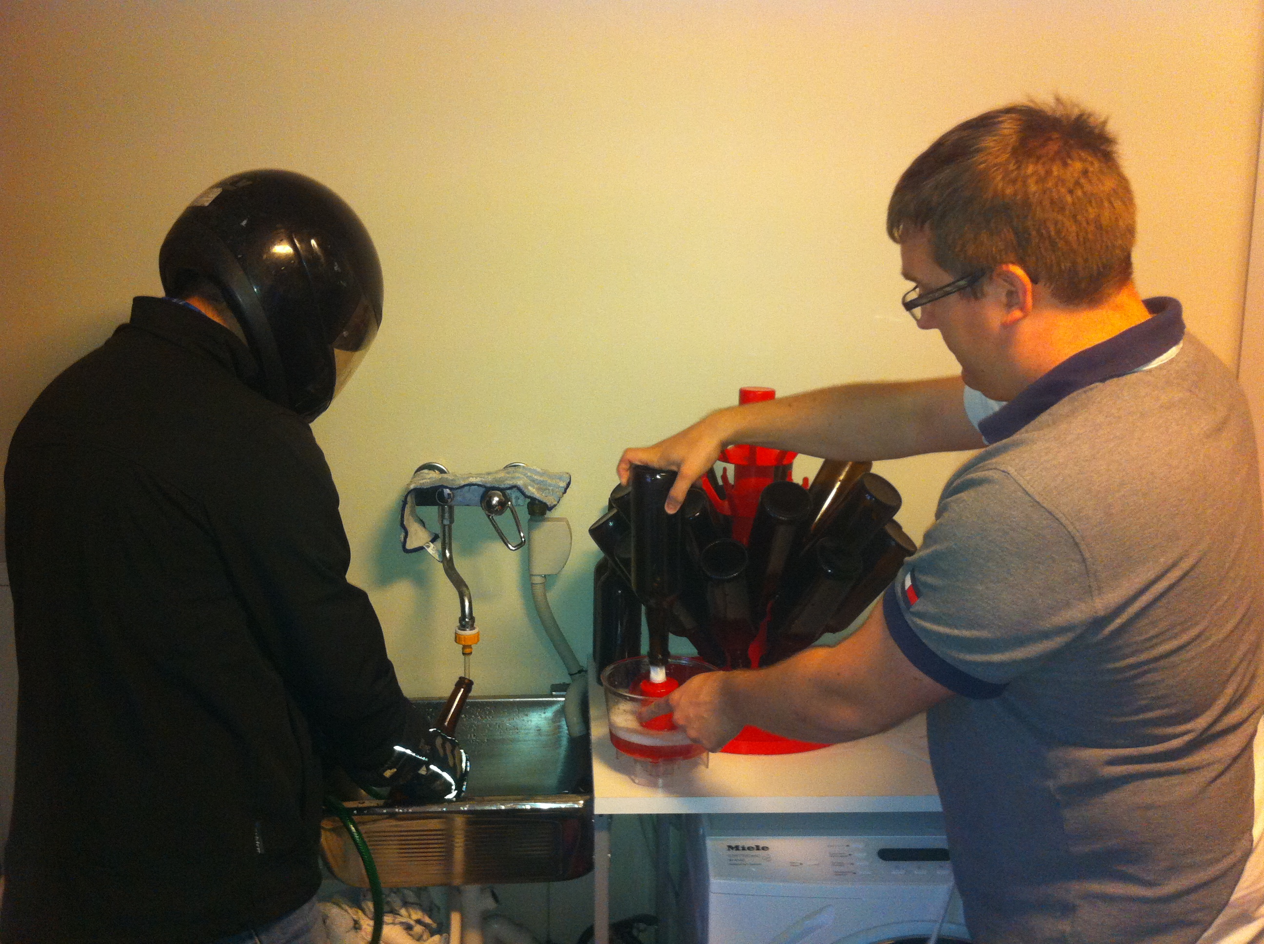 Vannet når ca 72 grader før vi hiver i kornet. Denne gangen har vi i underkant av 6 kg korn, så sirkuleringen går mye bedre denne gangen. Mesketemperaturen holder seg ganske stabil, og bryggerne kan bare sitte å slappe av. Siden vi brygger en ESB, så er det på sin plass å smake på ei flaske som vi fant i skapet. Smaker fortsatt veldig godt, håper vårt eget brygg vil ligne på dette til slutt.