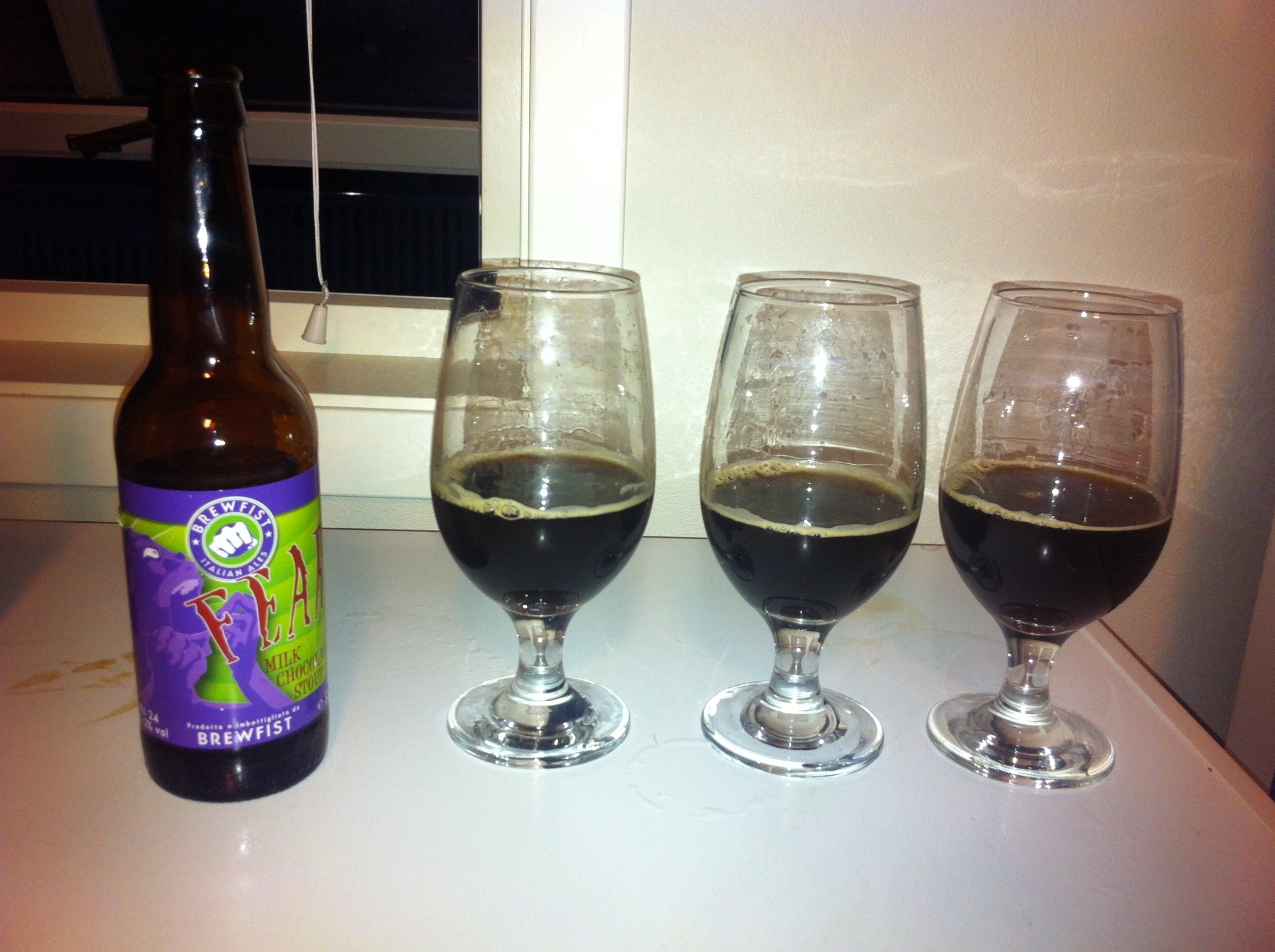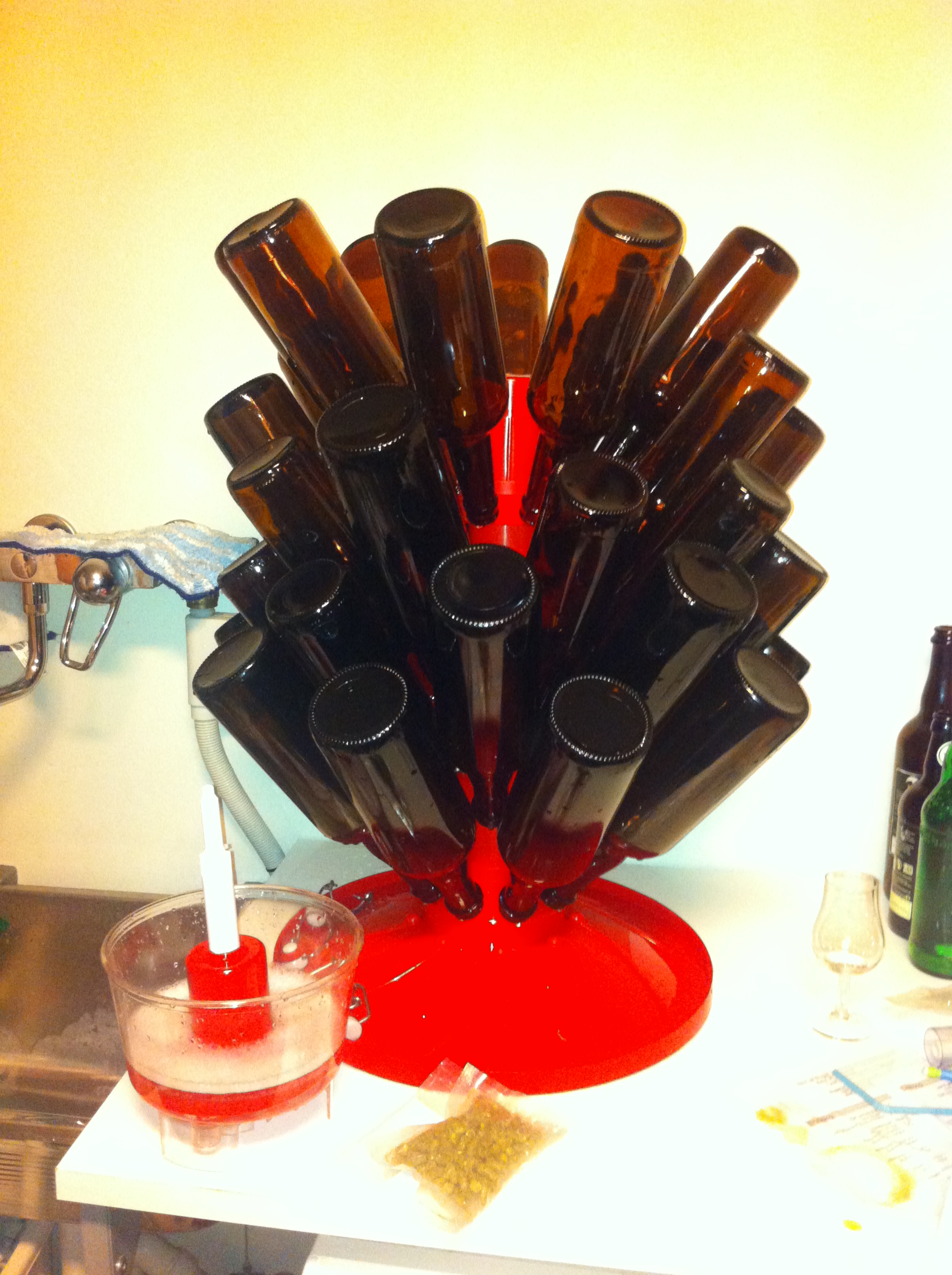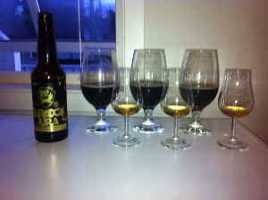 Normalt så har vi god tid til en øl mens vørteren kjøles ned, men det rakk vi ikke idag. Så da blir det en øl mens vi vasker utstyret istedetfor. Nok en belgier fra Leffe, Leffe Brune. Eller Leffe Skum som den også kalles. I likhet med sin blonde søster så er også dette ølet godt fyldig med en tydelig sødme. Sødmen går kanskje mer mot karamell i dette ølet. En mer tydelig bitterhet og maltsmak gjør at sødmen er mye bedre balansert her. Også noe krydderpreg. Lang og behagelig ettersmak. Typisk koseøl, veldig godt.