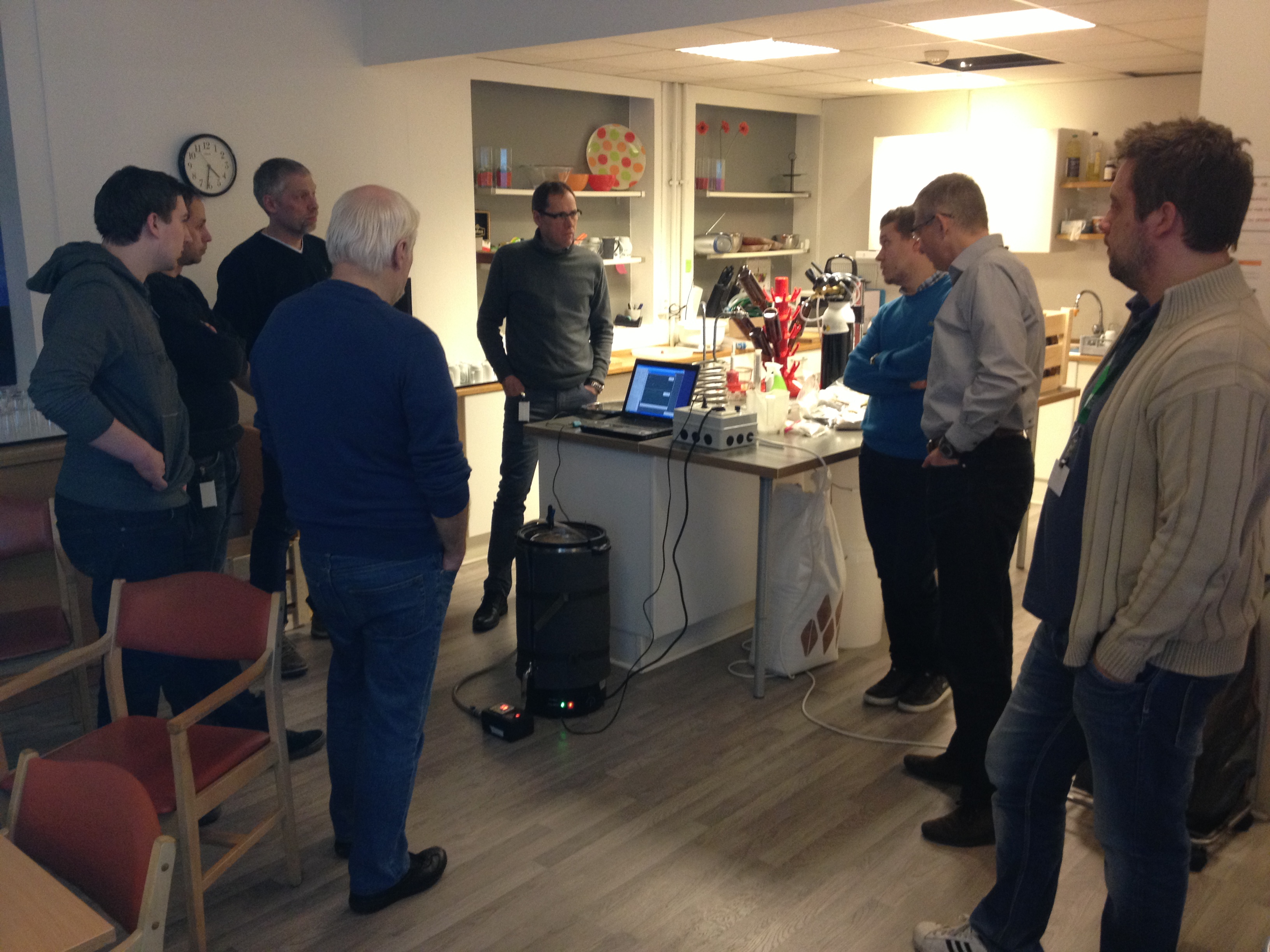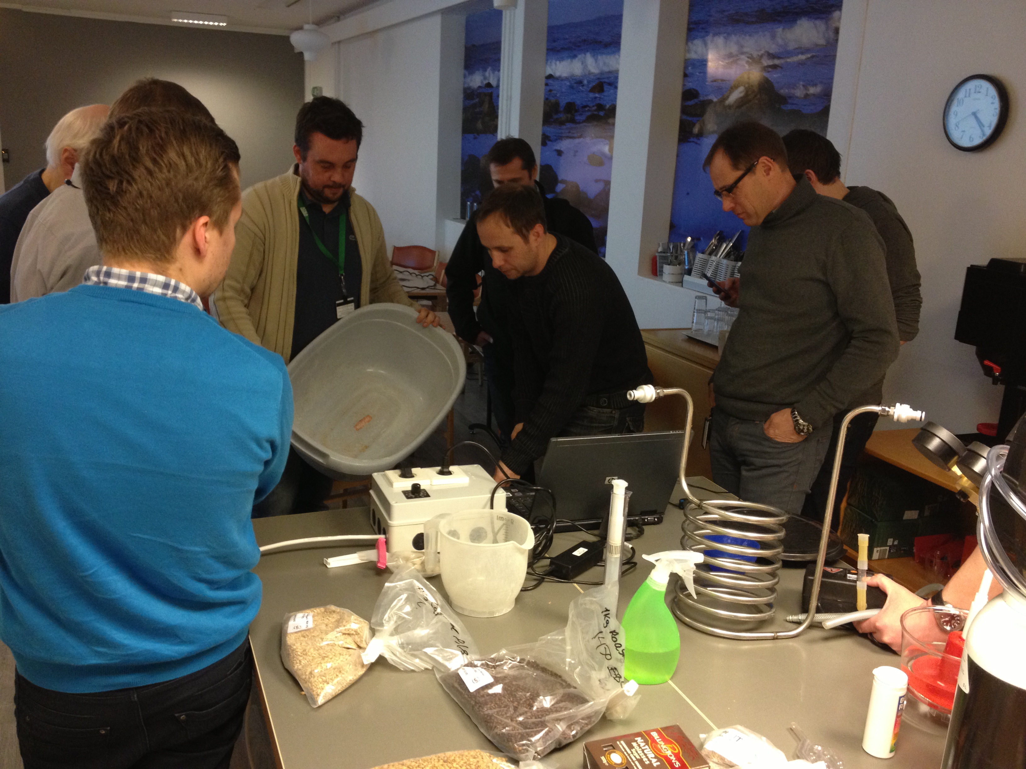 Det er klart for å flaske øl igjen. Denne gangen er det ølet vi brygget på ølkvelden i jobbkantina. Ølet har nå stått en uke i øleskapet, og så en uke i romtemperatur da vi trengte øleskapet til påskeølet vårt. Siden det er såpass kaldt ute så har temperaturen inne vært ganske stabil, så dette burde ikke være noe problem. Vi måler FG til 1.018 og satt inn i den automagiske ølbryggeformelen så har vi fått et øl på knappe 5,2%.