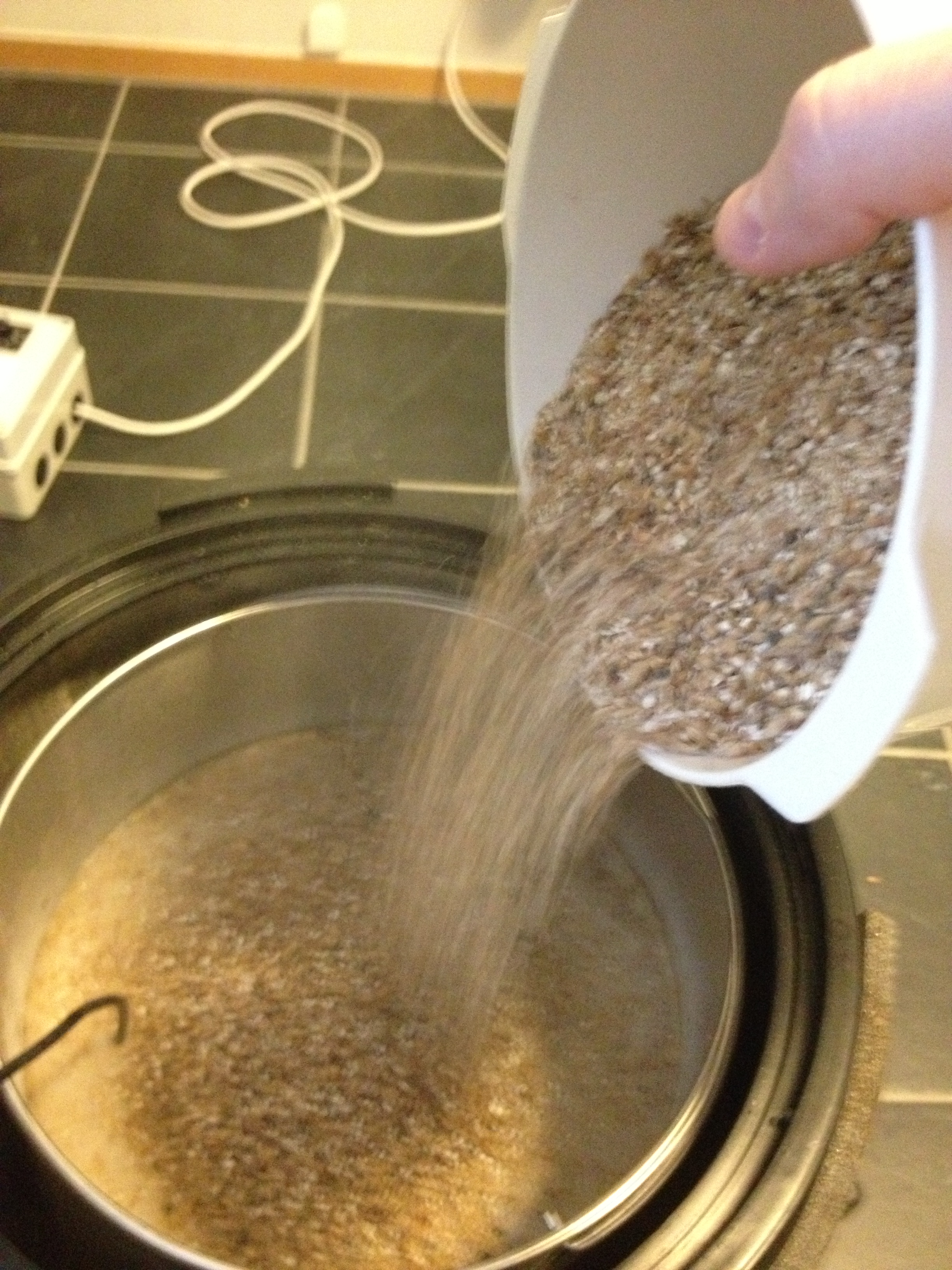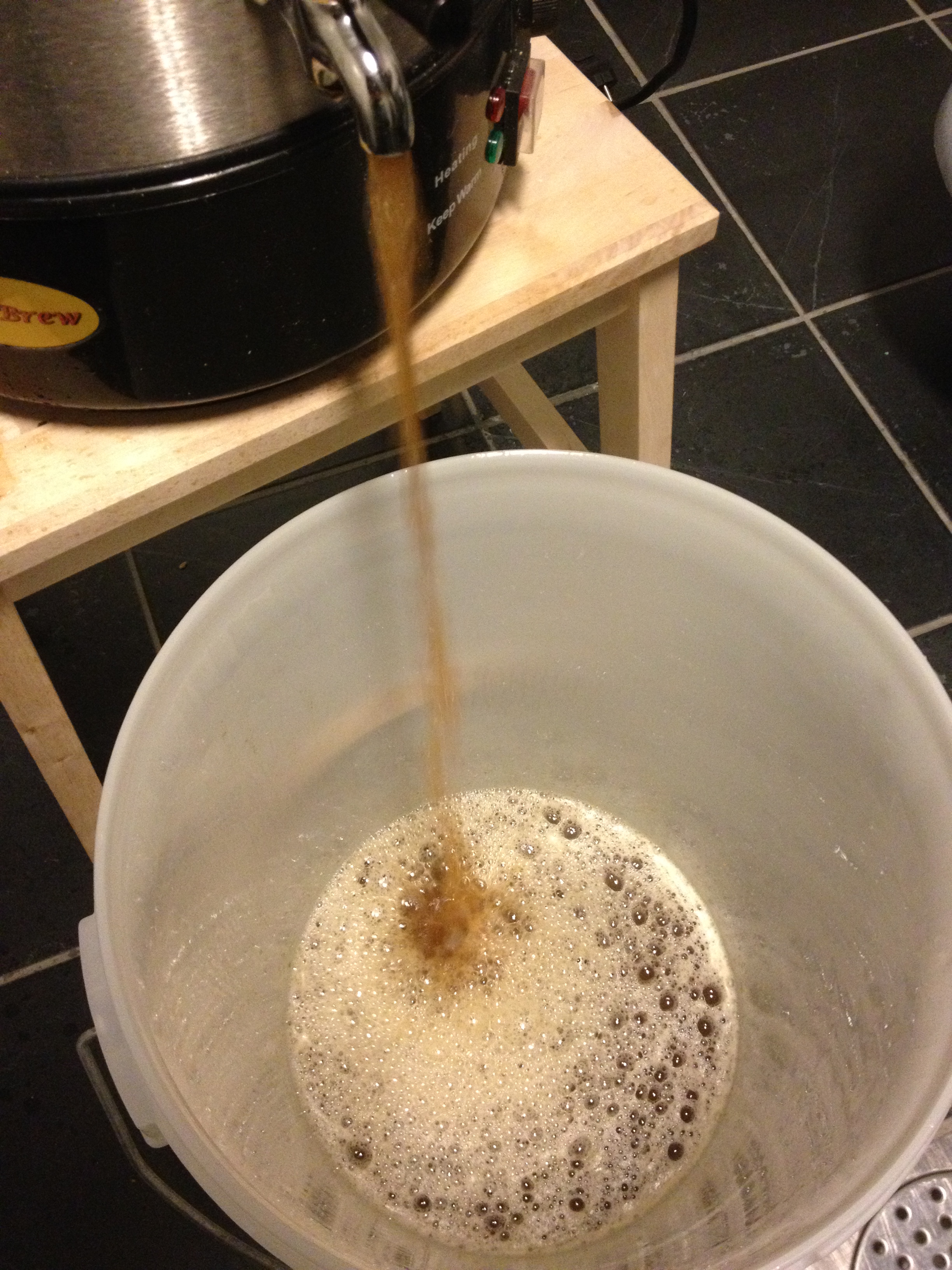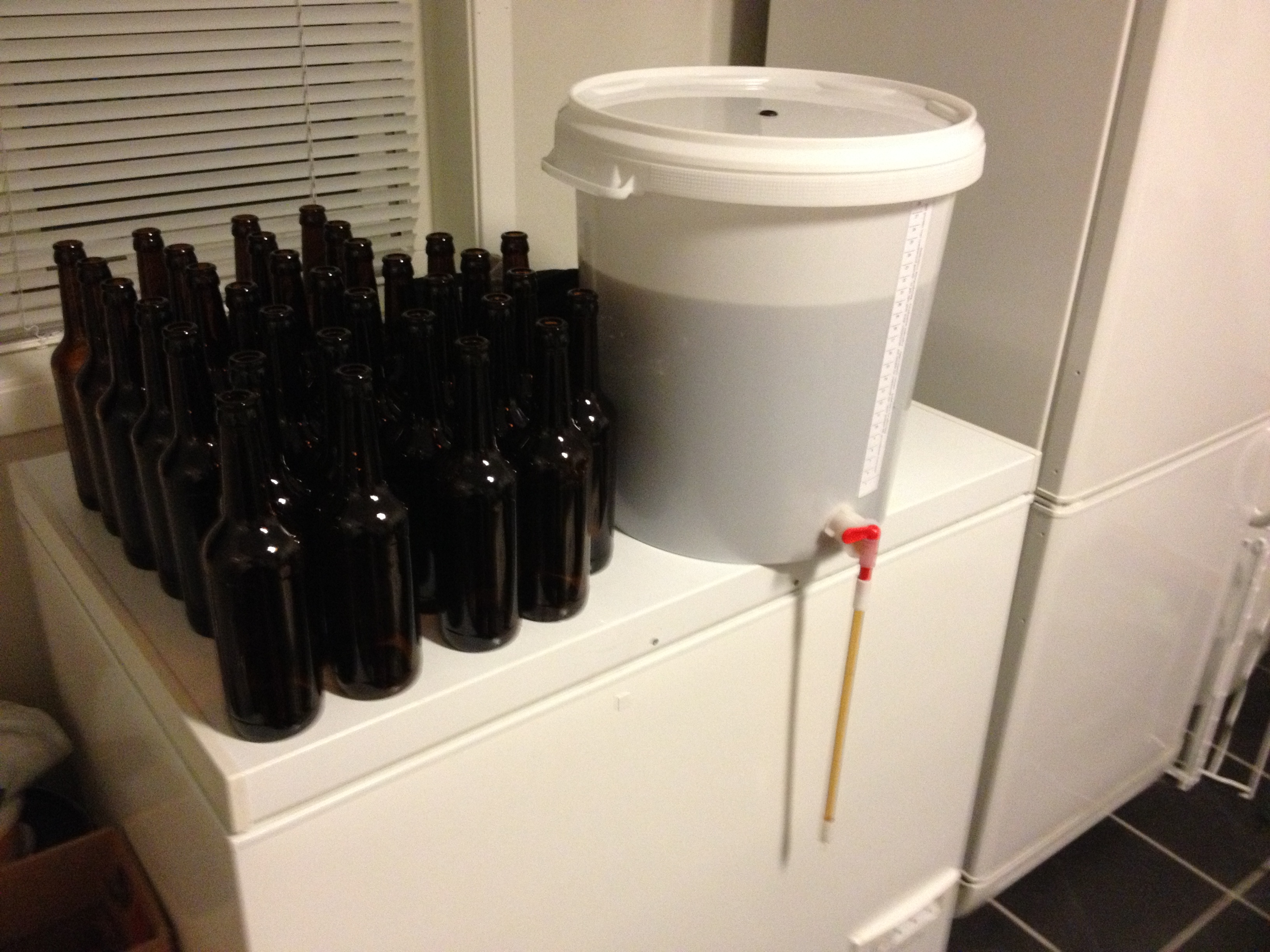Den andre nye dingsen er dette gjæringskaren med en kran, og med en flaskefyller som kan festes på kranen. For å fylle flaskene trer vi bare flaske opp på flaskefylleren, og en liten fjærmekanisme i enden på flaskefylleren gjør at ølet flommer ut så snart den treffer flaskebunnen. Det at flaskene blir fylt fra bunnen er visst ganske riktig sånn faglig og teoretisk sett, så dette må klassifiseres som et knallkjøp av oss. Om vi skal sette fingeren på noe, så er det litt upraktisk at ventilen står noen cm over bunnen, og samtidig går litt inn i selve karet. Dermed er det ganske vanskelig å få ut den siste slanten i karet.