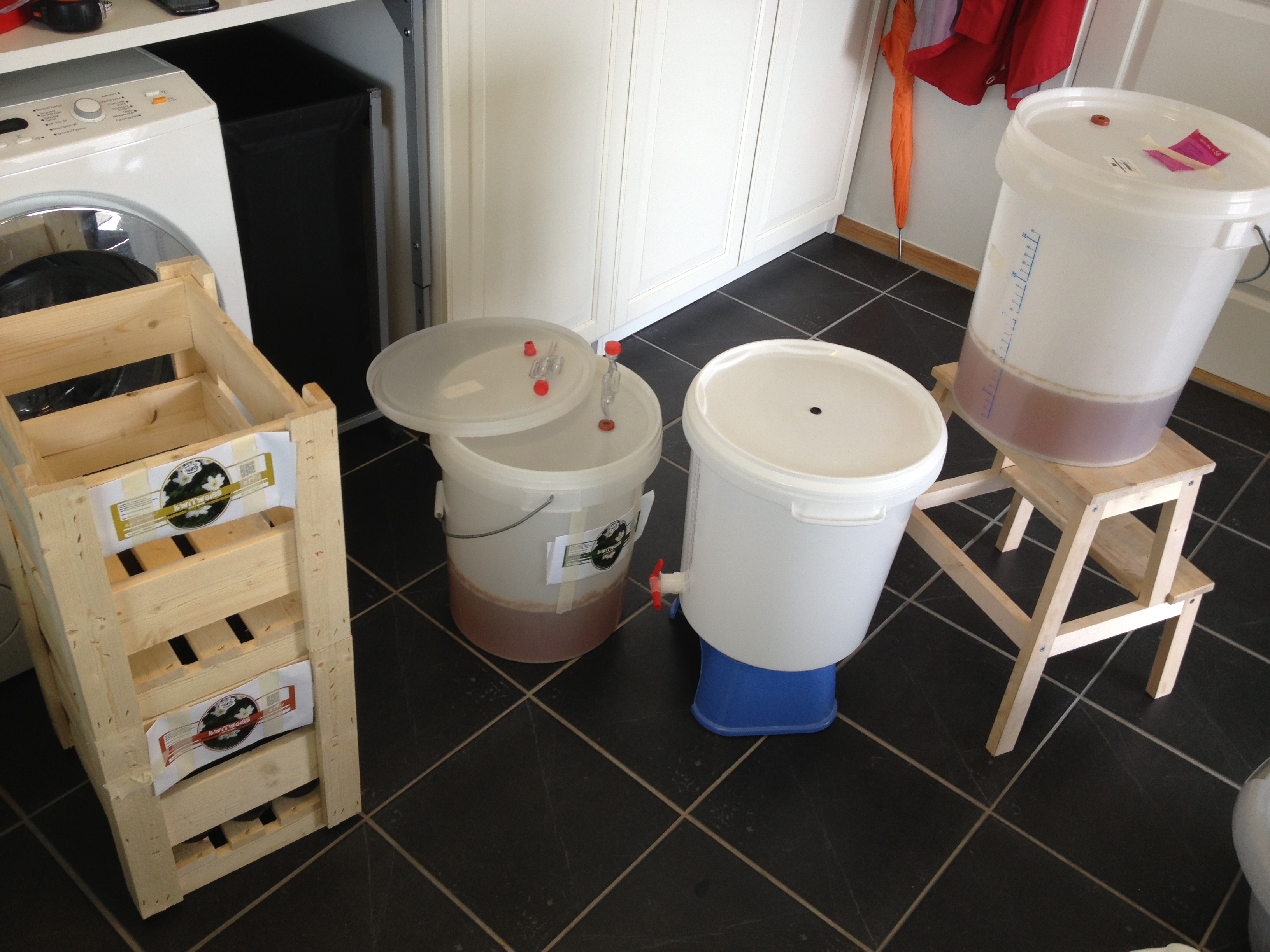 Vi har ikke plass i gjæringsskapet til alle 3 dunkene, så vi setter alle dunkene til gjæring i romtemperatur. Dermed får de identiske vilkår, og det blir spennende å sammenligne gjæringsforløp og ikke minst smak etter hvert.