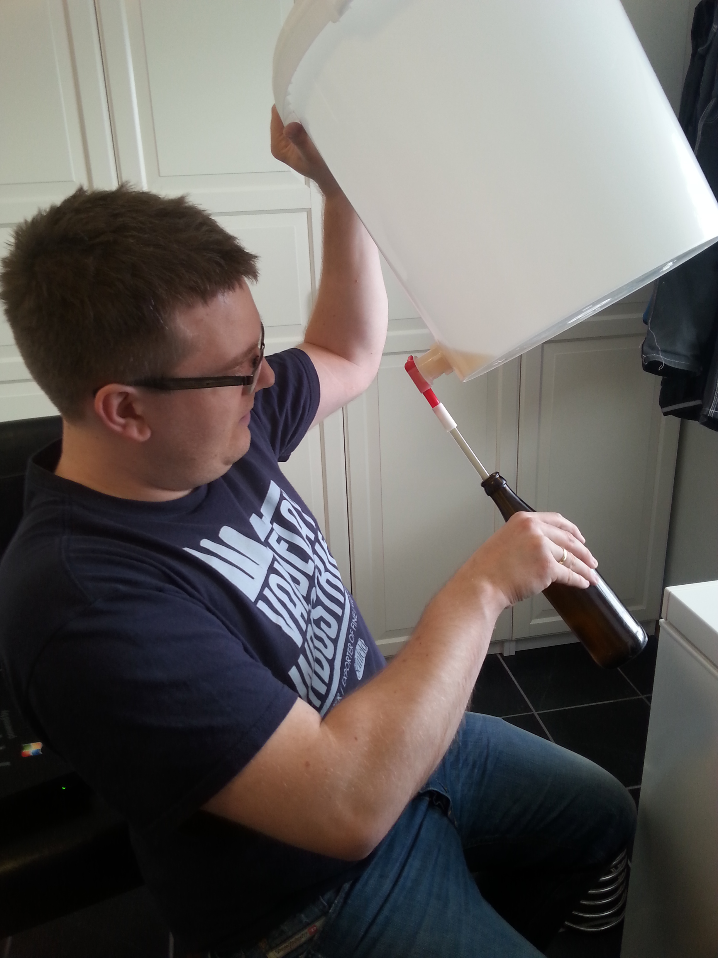Bryggingen går mot slutten, og vi tapper over på 3 gjæringskar og tilsetter de ulike gjærtypene. På grunn av Knolls vanntriks så ble det hele 28 liter øl, men med en skandaløs OG på 1.043-1.044. Nå bør vi få normal utgjæring, ellers så har vi brygget lettøl.