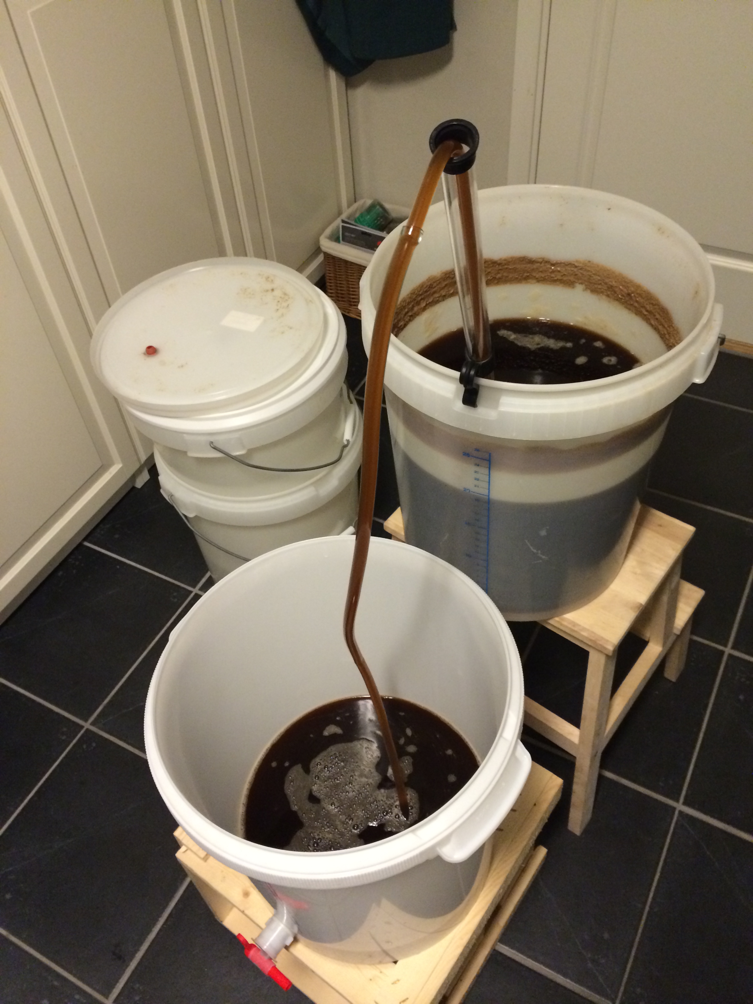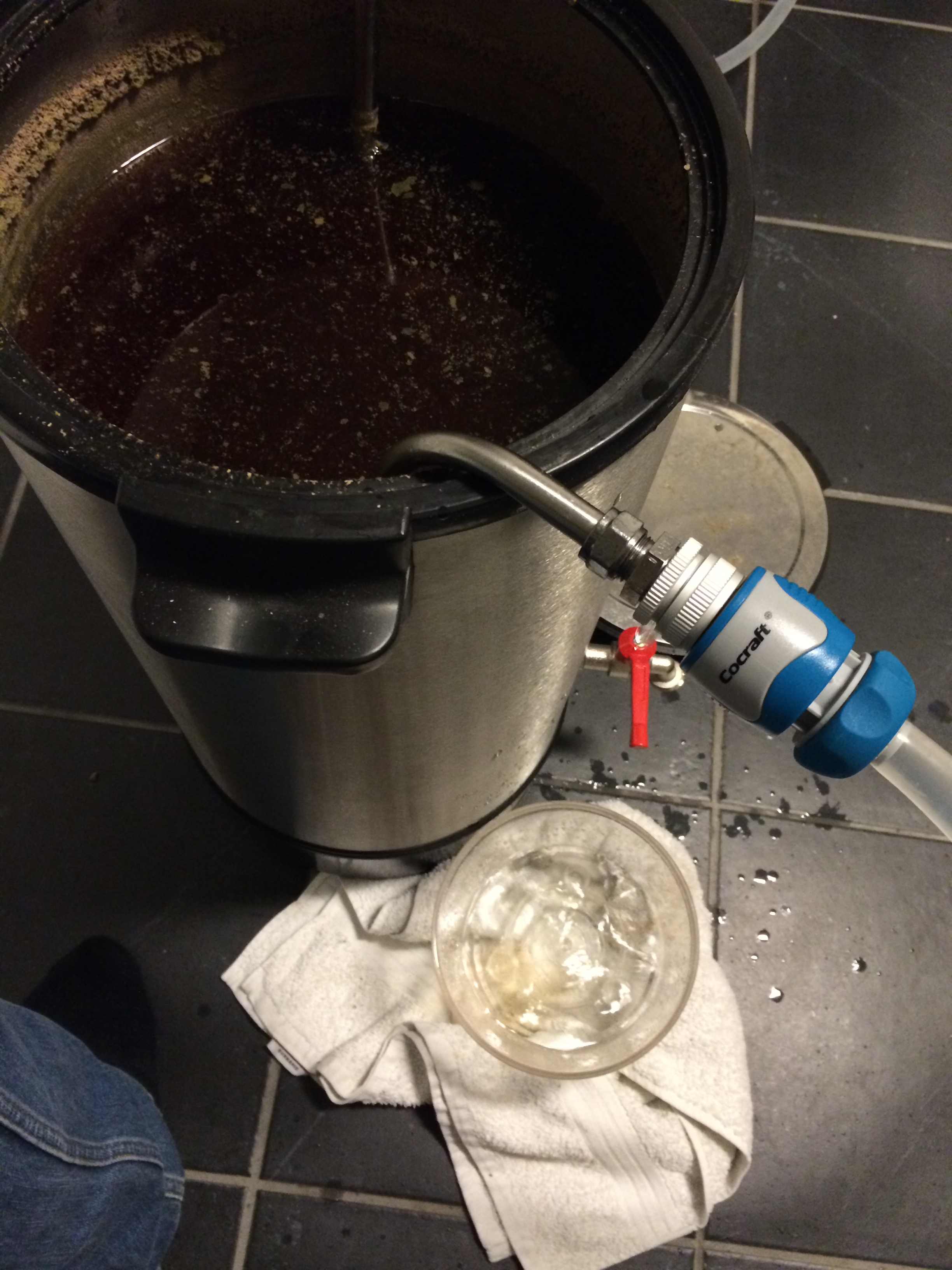Ekstra lang koketid denne gangen, så vi var litt bekymret for om det skulle dampe vekk for mye dampøl under kok, men etter å ha brukt litt ekstra skyllevann så virker det som at dette vikk veldig greit. Litt ekstra vann fikk vi også på gulvet under kjøling, da ene koblingen på kjøleren vår er lekk. Ellers er vi meget fornøyde med kjølingen vår denne kvelden. For en gangs skyld husket vi både å skru av varmelementene på BB30en og fjerne isolasjonen rundt da vi begynte kjølingen. Vanligvis kommer vi på dette cirka halvveis.
