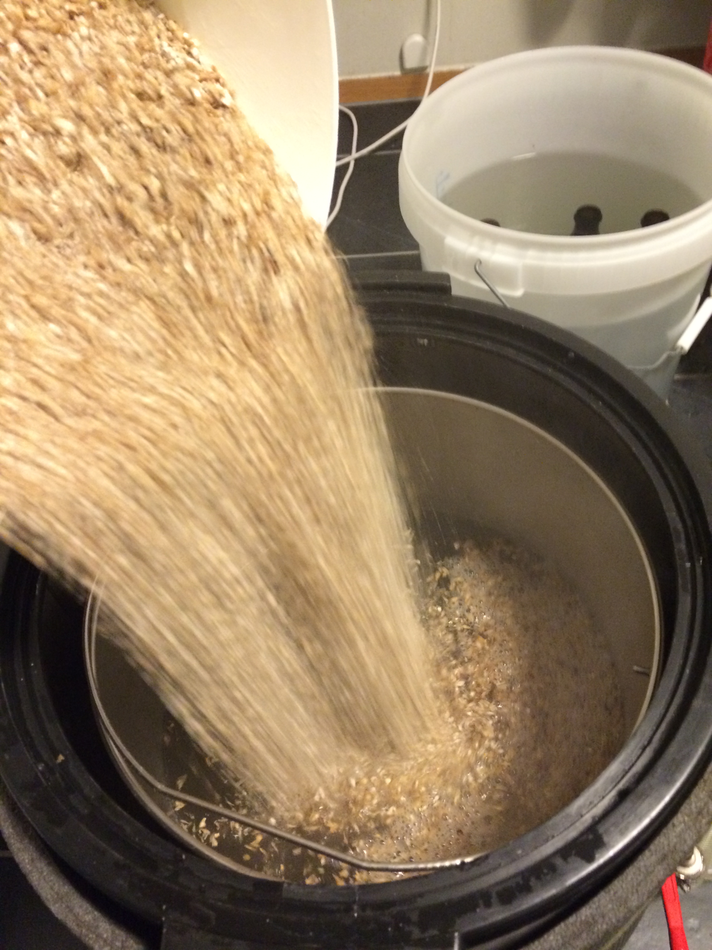 Dagens kornbilde er et skikkelig actionbilde! Her er meskevannet varmet opp og kornet tilsettes. Det viste seg etterhvert at oppveingsansvarlig kanskje hadde tatt på seg spanderbuksene i dag, for det ble ganske mye korn og litt for tett i mesken. Men det ordnet seg etterhvert med litt god staking.