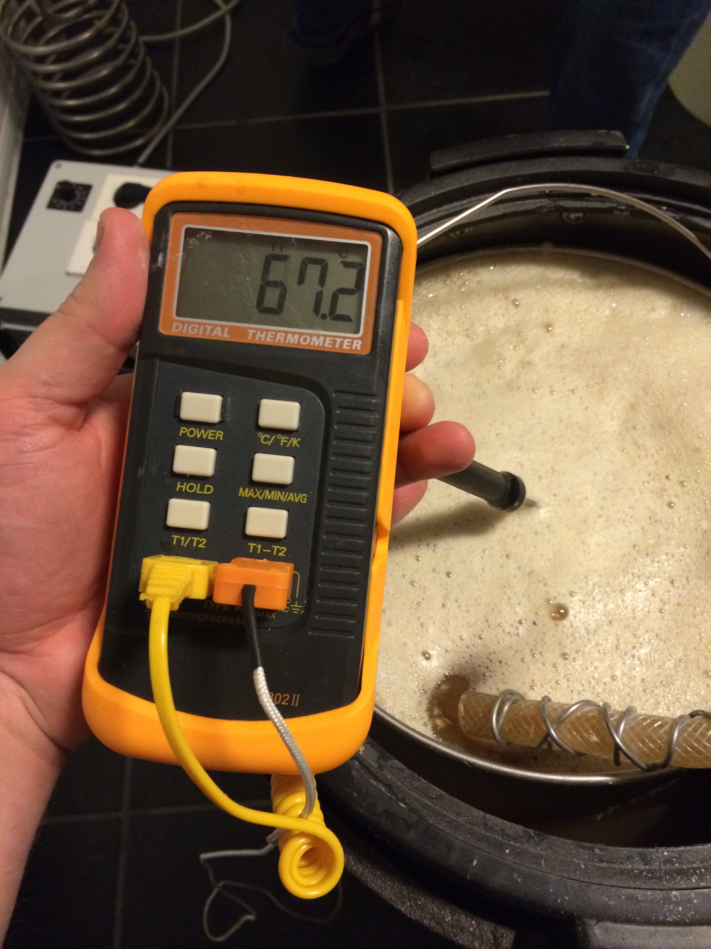 Vi tenkte å holde oss på 66-67 grader i dag, men vi hadde kanskje litt lav striketemperatur, så det tok litt tid å komme opp i riktig temperatur. På/av knappen på BB30en har forresten tatt kvelden, men heldigvis så er den permanent PÅ og ikke AV, så er det ikke noe problem å få brygget.