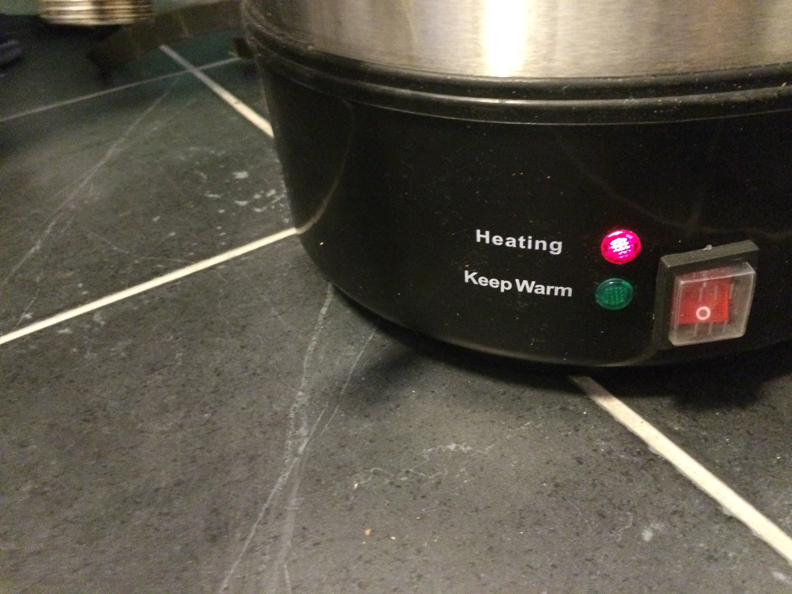 Siden vi har begrensede mengder med humle, og kun nok til en 25 liters batch, så tenker vi å kjøre et siste brygg med BB30’en. Etter å ha satt på varming av meskevannet så oppstår et lite problem. Det skjer ikke noe oppvarming av meskevannet. Lyset er på, men det er ingen hjemme… Typisk at slikt skjer med utstyret akkurat på siste (?) brygget. Spørs om dette er en eller annen form for streik.