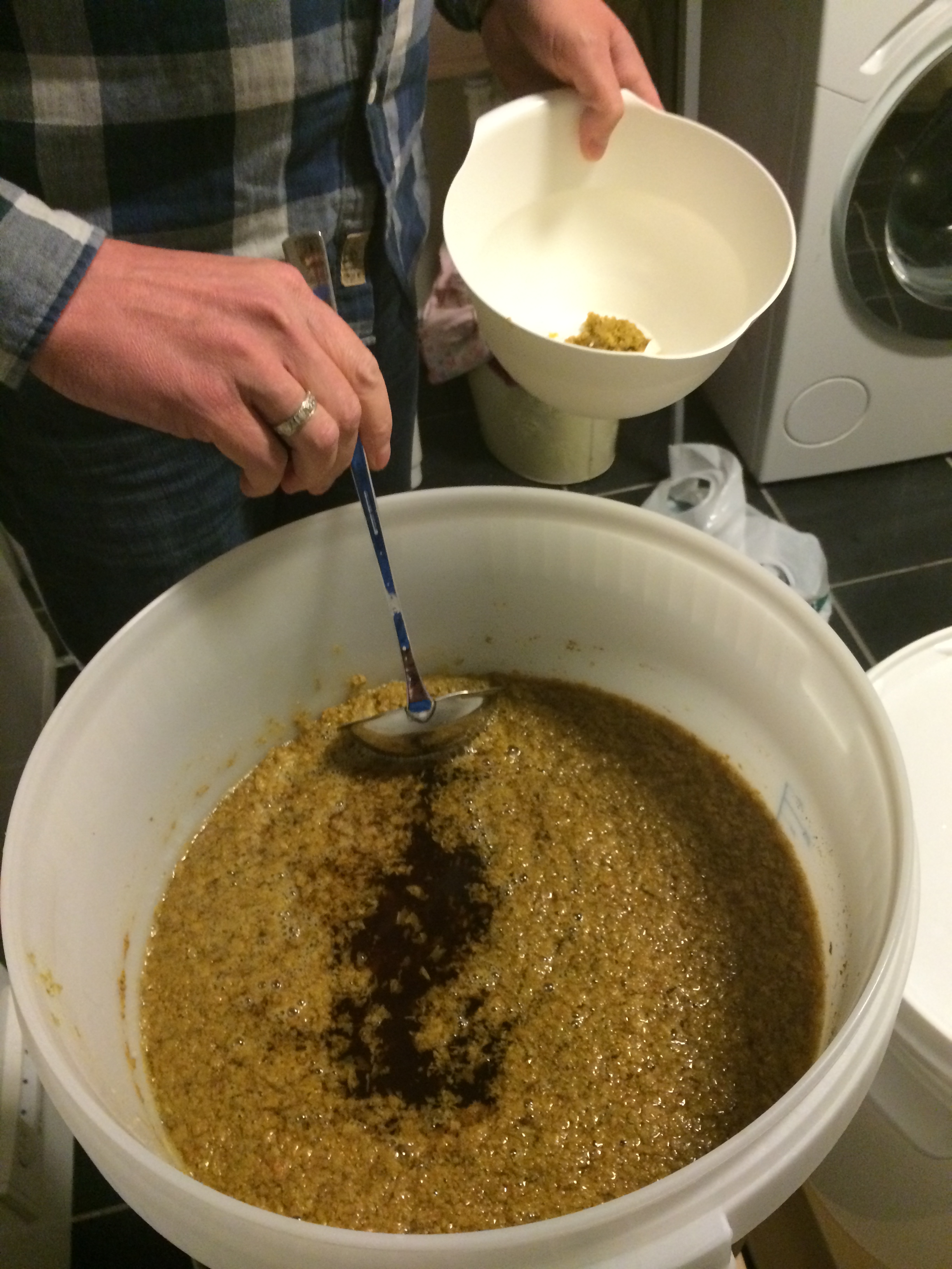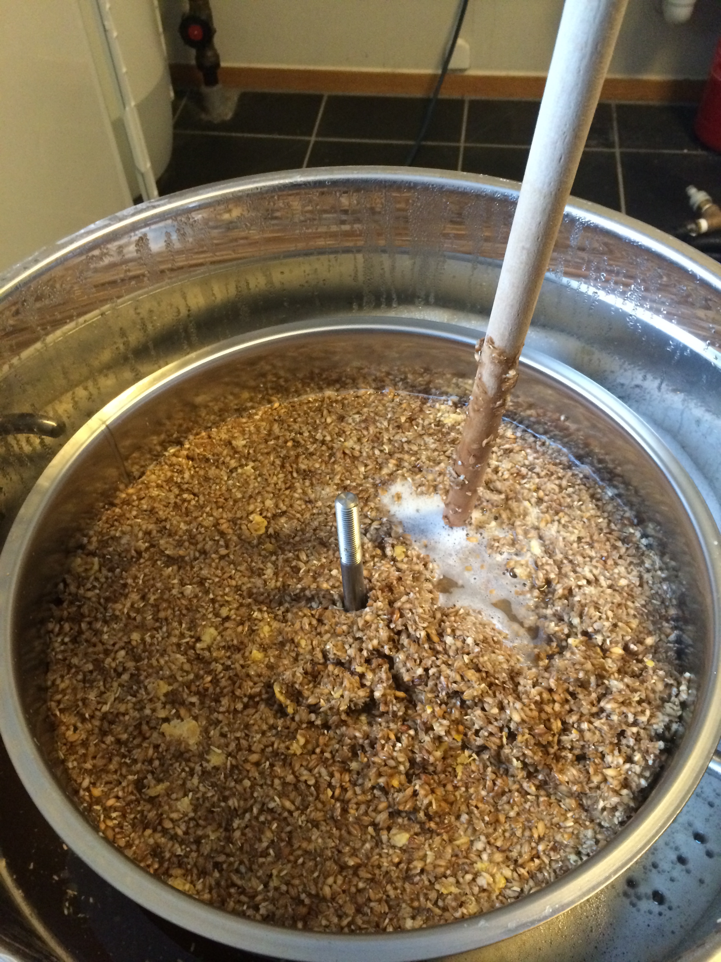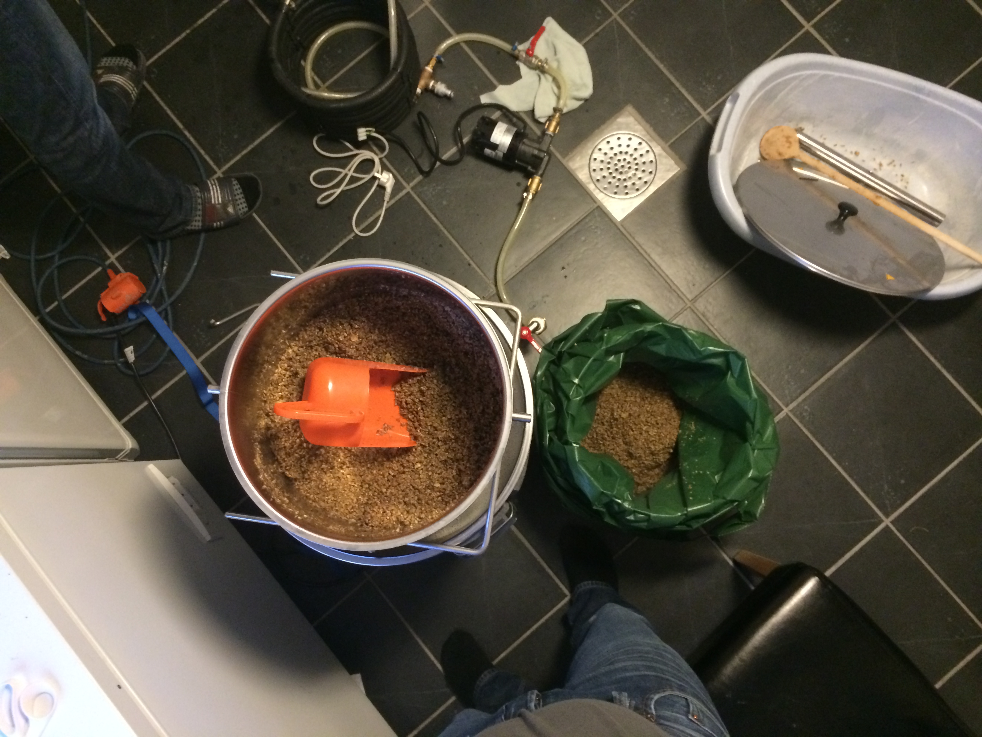 Mesking og utmesking går greit. Det var av en eller annen grunn veldig tett mellom maltrøret og ringen som holder røret oppe når vi skal skylle, og det holder på å renne over flere ganger. Det er sikkert en streik på gang her også.