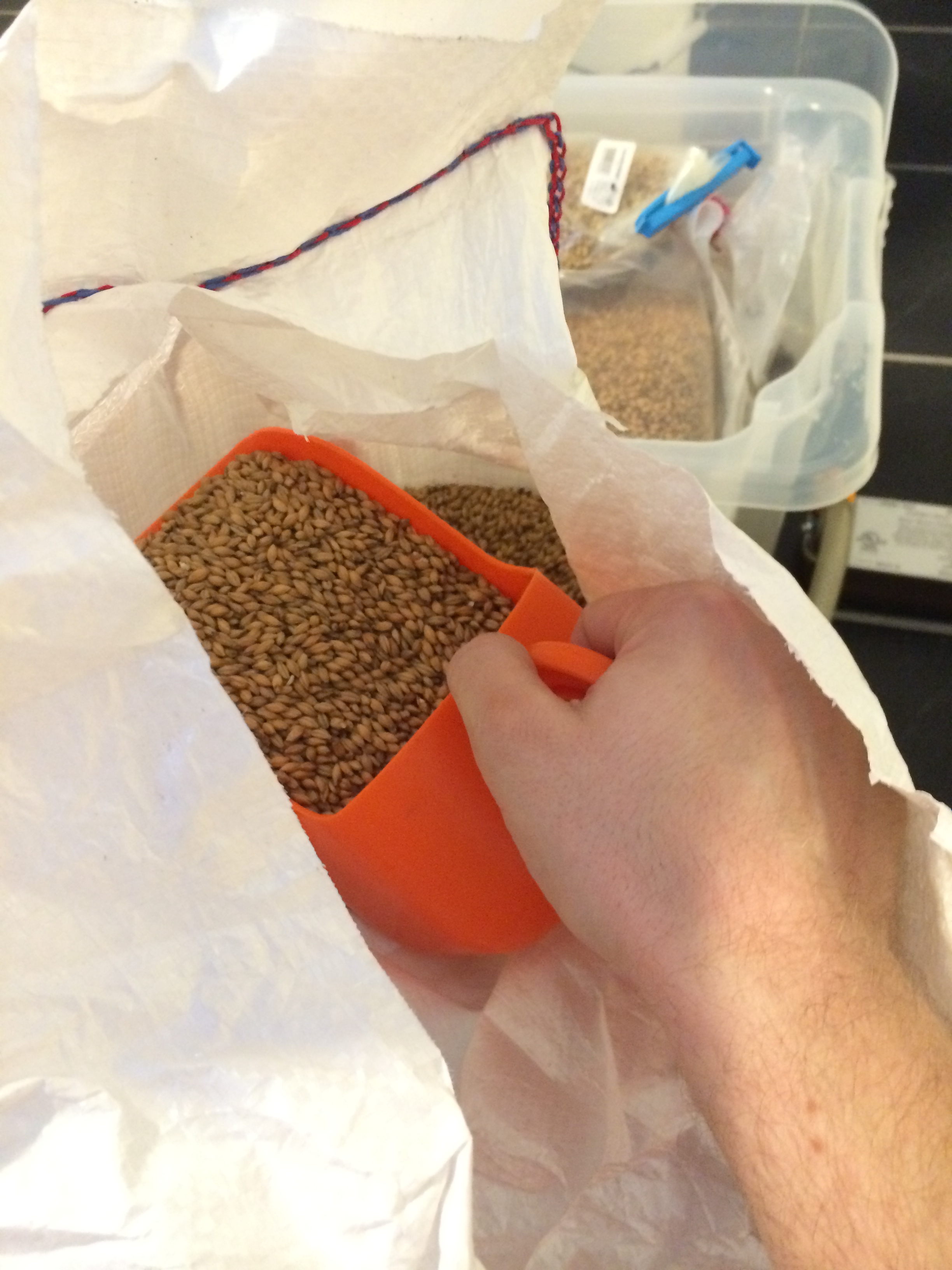 Vi veier opp humla, og gjør klar til koking. Imens smaker vi på et par øl som har stått altfor lenge. En Ægir Sumbel Porter med «Best Før» merking våren 2013, og en av hveteølvariantene vi brygget for et år siden. Begge var definitivt best før, og begge havnet etterhvert i vasken. Vi får stramme opp kjellermesteren vår slik at ikke ølene blir stående så lenge.