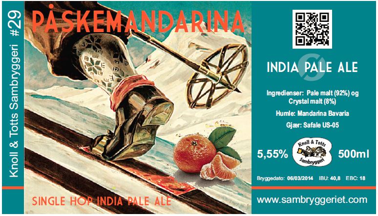 Nylig fikk vi tak i litt Mandarina-humle. Dette er en ganske ny humlesort med preg av sitrus, fruktighet, krydder og litt sødme. Eller Mandarinpreg om du vil. Dette må være den perfekte humle til en jule-IPA. Bare synd det er ca 300 dager igjen til jul, og så lenge gidder vi ikke vente. Nå varer som kjent jula helt til påske, og mandarin er jo ganske lik appelsin egentlig, så da kjører vi på med en Påske-IPA istedetfor.