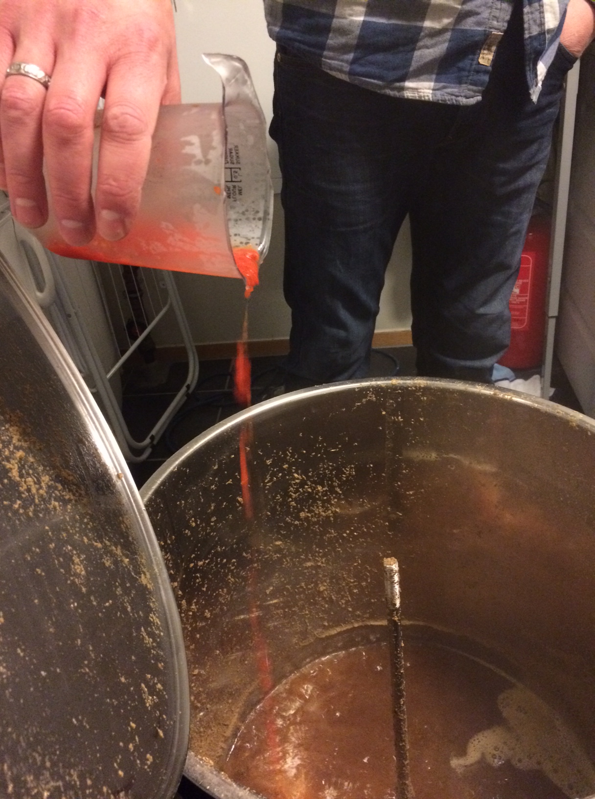 Siden vi har med en bryggeslave gjestebrygger er det han som får «æren» av å røre rundt i mesken underveis. Vi har av arbeidsrettsjuridiske årsaker kuttet han vekk fra bildet siden han ikke har arbeidskontrakt hos oss.