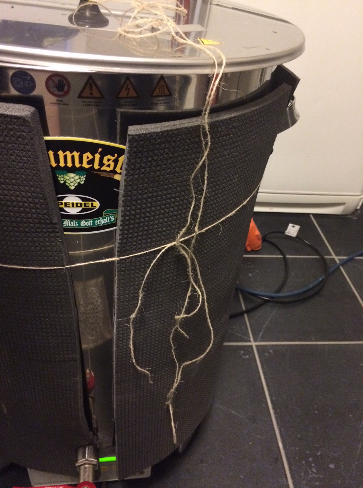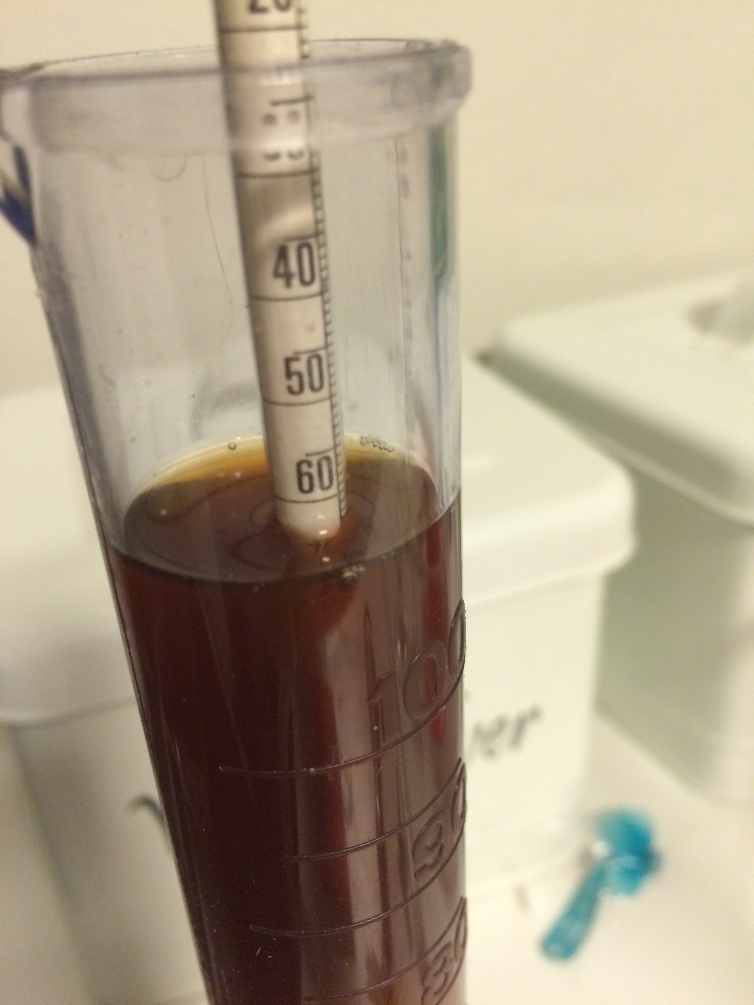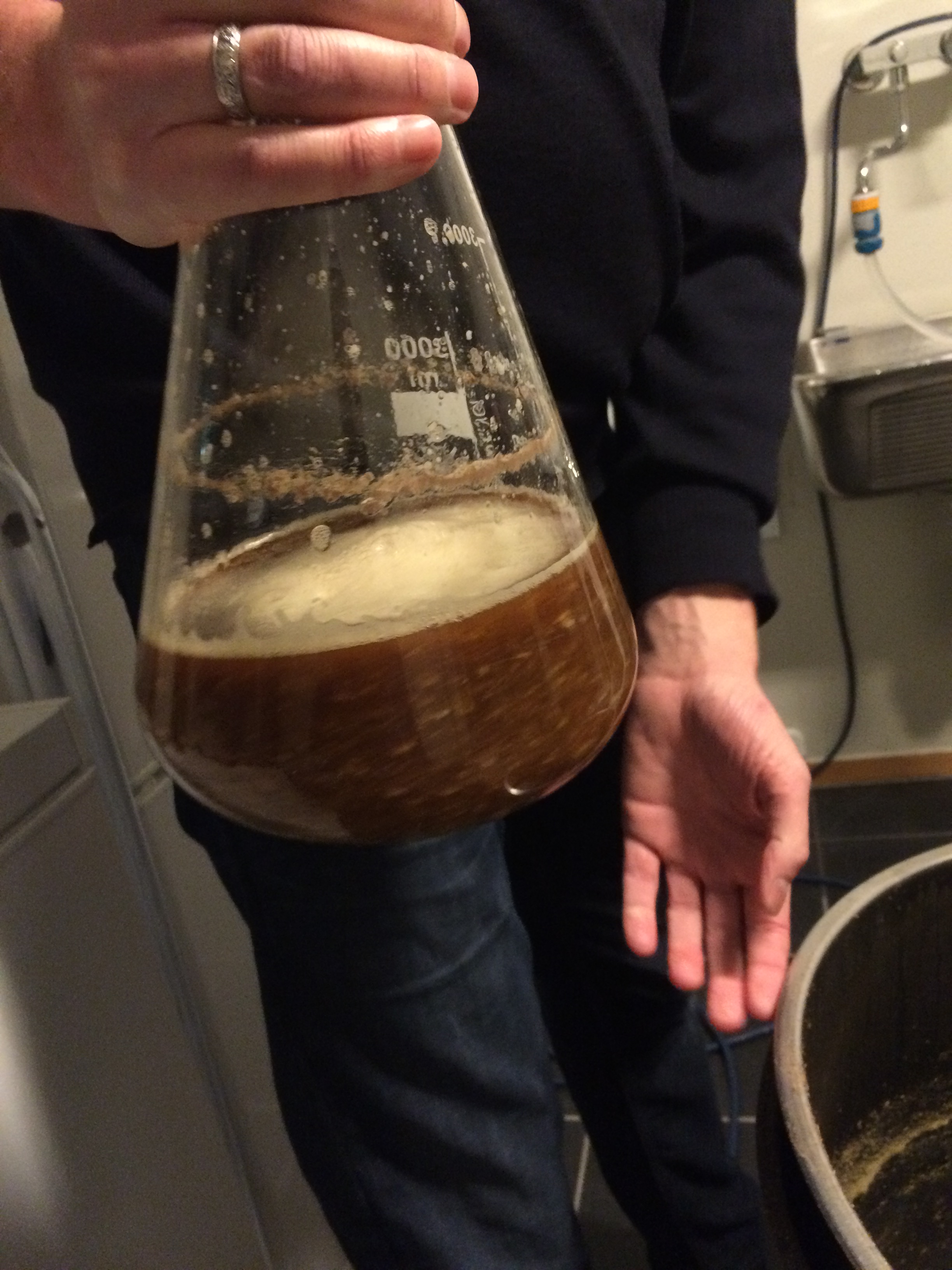 Apropos bunnfall. Vi hadde litt gammel gjær denne gangen, noe vi måtte kompensere med økt mengde. Mye gjær og halvstor starter ble litt i meste laget for den lille magnetpinnen i magnetrøreren vår, den klarte ikke å dra rundt starteren slik den burde. Vi er dermed litt i tvil på om vi har klart å dyrke opp nok gjær.. Men vi har ikke noe annet valg enn å la det stå til, så får vi håpe på det beste. Vi skriver også opp «større magnetpinne» på handlelista.