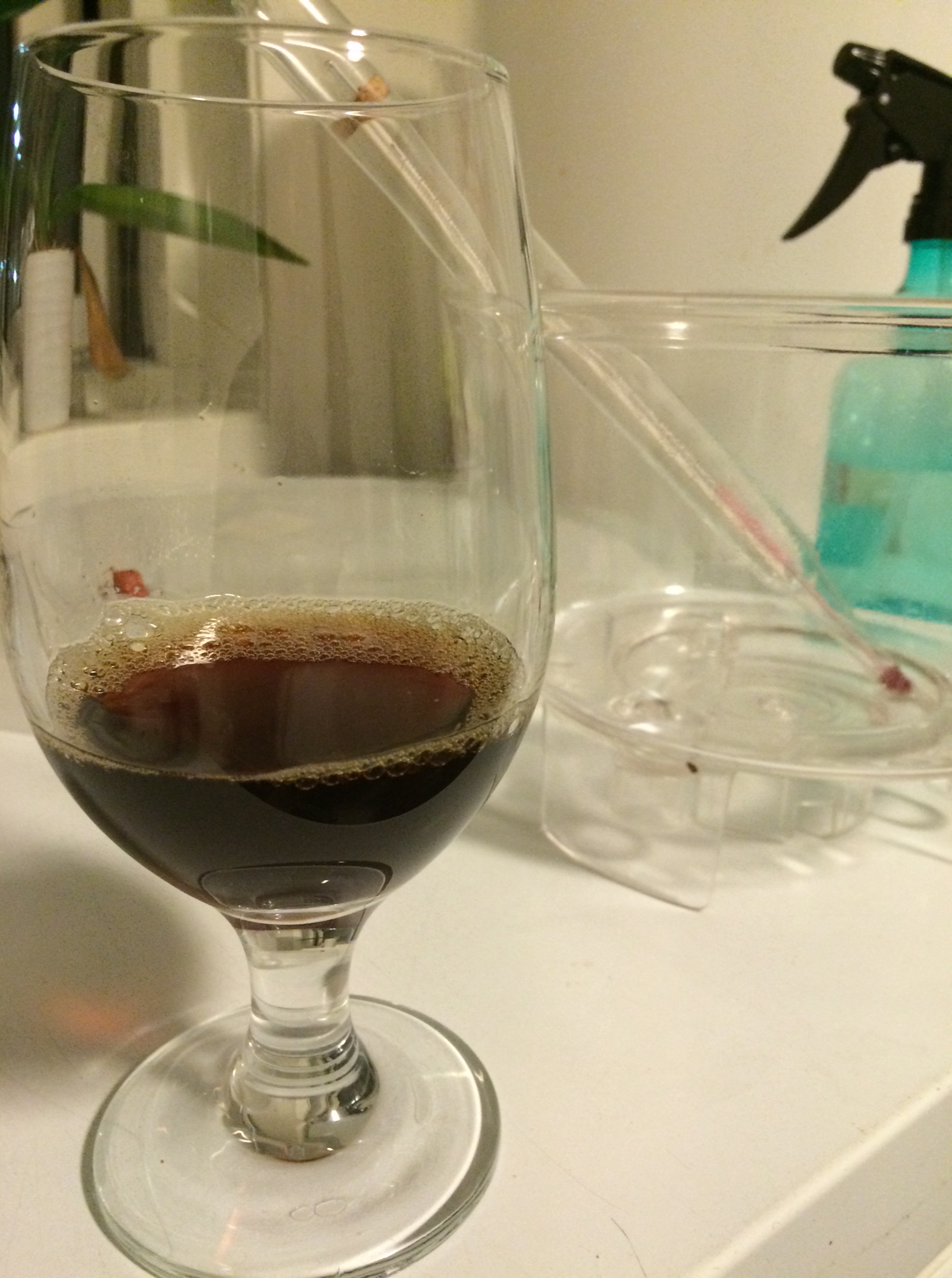 Vi er litt late, så vi tapper dagens produksjon rett på gjærkaka i de brukte brown ale dunkene. Dette er første gangen vi gjenbruker gjær uten å vaske den først, så vi krysser fingrene og håper på at det ikke kommer noen komplikasjoner på grunn av det. De opprinnelig planlagte 20 literne med ESB ble til slutt 50 liter, men da er et par liter trub fra forrige batch inkludert. Uansett så fikk vi en OG på 1.062, nesten litt i overkant mye. Og uansett så har vi hatt en rekordhøy meskeffektivitet etter vi begynte med Speidelbrygging. Det er moro, vi får skylde på maisen. Vi glemte forresten å tilsette klarningsmiddel også på slutten av koketida, maisen får ta skylda for det også.