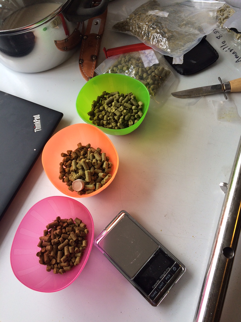 Det tar ikke lang tid før vi finner ut at vi har ikke nok Galena, og ikke et eneste gram Centennial, så da får vi justere litt etter det vi har i humlefrysteren. Vi erstatter med Amarillo og Cascade, og så tar vi oss en tur på bryggebutikken for å handle Centennial før vi skal tørrhumle.