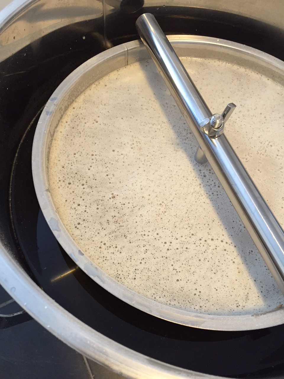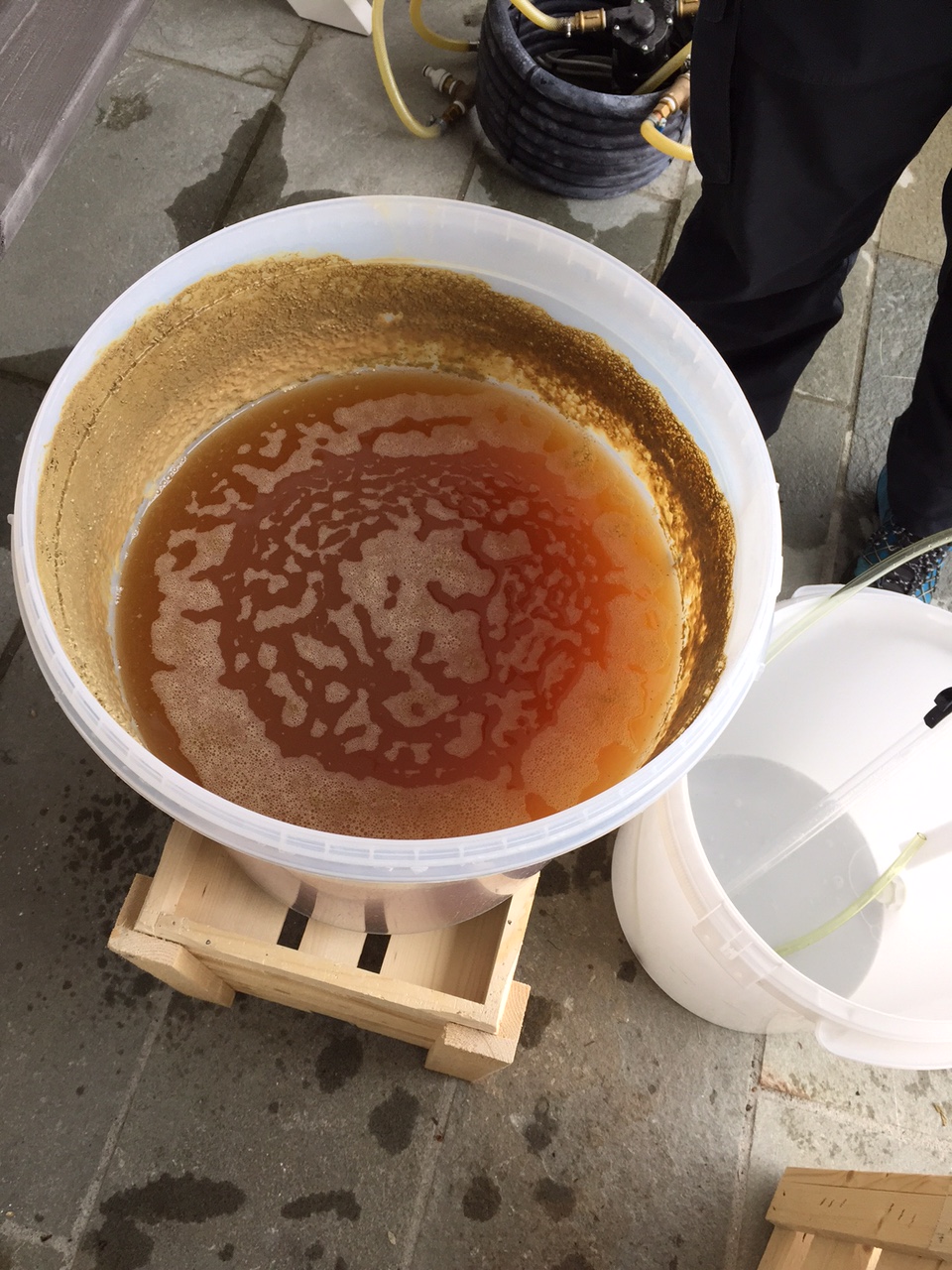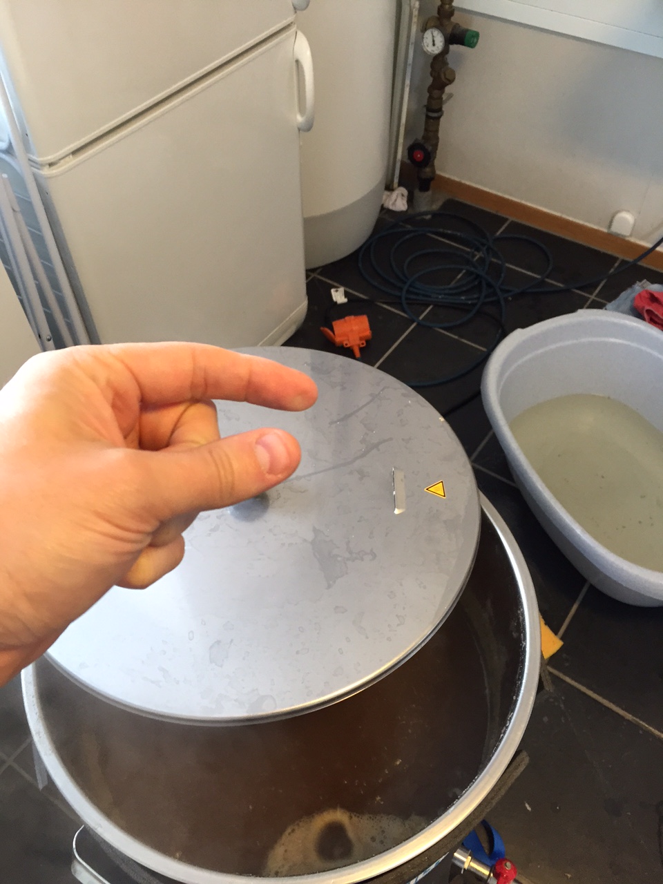 Og apropos gjæringskar. Vi er litt for late og gjerrige denne gangen, så vi gjenbruker gjær fra APAen vi nylig flasket. Og da har vi selvsagt vasket slurryen og målt opp riktig mengde? Nei. vi har ikke engang giddet å vaske gjærkaret, og vi tapper rett på den gamle gjærkaka. Overpitching deluxe med andre ord. I etterkant ser vi i faglitteraturen at vi nå har 4-5 ganger så mye gjær som vi trenger, og det er ikke helt heldig. Vi får revuderere denne strategien neste gang. Men aktiv er den denne gjæra. Allerede en time etter at vi har tilsatt oksygen og satt dunken til gjæring så plupper det bra i gjærlåsen.