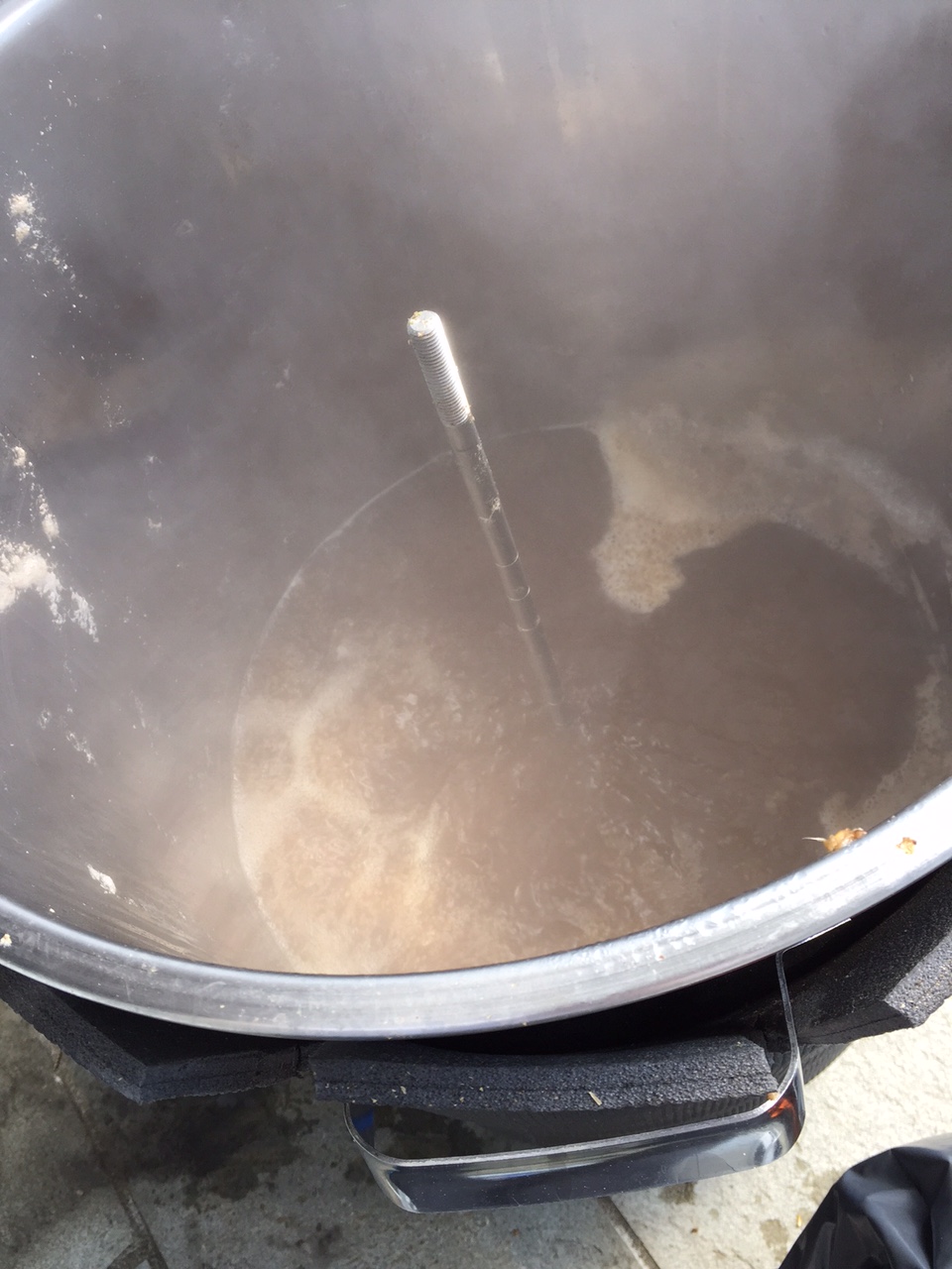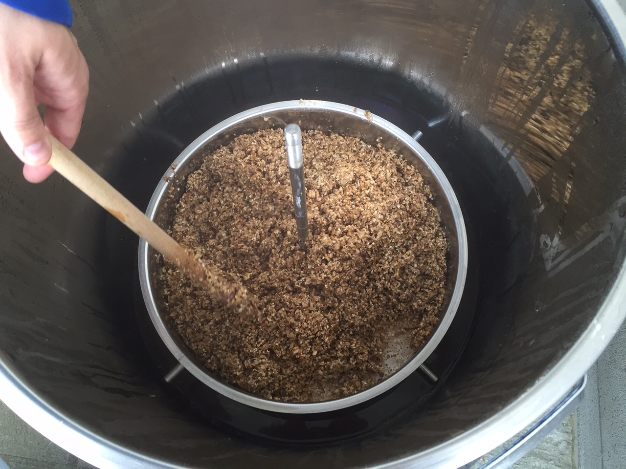 Vi liker godt IPA, så da prøver vi med litt mer vann den gangen her, fyller opp med vann nesten til den øverste streken på stanga i Speidelen. Da blir det mer IPA til slutt tror vi. Vi begynner å nærme oss maks på meskevann ser det ut til.