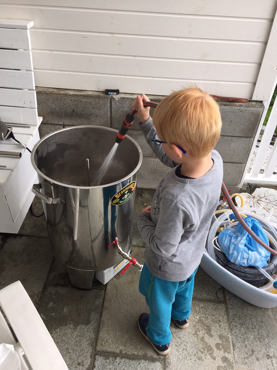 Høyt kvalifiserte medbryggere også til fylling av vann. For anledningen uten godkjent verneutstyr. Som en del av taktikken for å nå opp til planlagt OG så bruker vi litt mindre vann enn vanlig, i underkant av 50 liter til meskingen, og også noe mindre skyllevann.