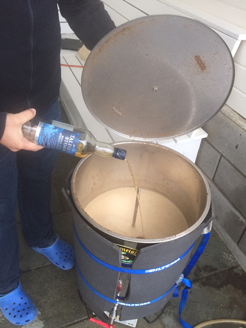 Det ga mersmak å putte ting oppi ølet mens det koker. Med litt whiskymalt i brygget, så kan det sikkert ikke skade med en ørliten dæsj maltwhisky heller tenker vi. Så her går litt single malt fra Isle of Skye i koken. Det gir nok et enormt smaksbidrag i sluttproduktet. Eller kanskje ikke.
