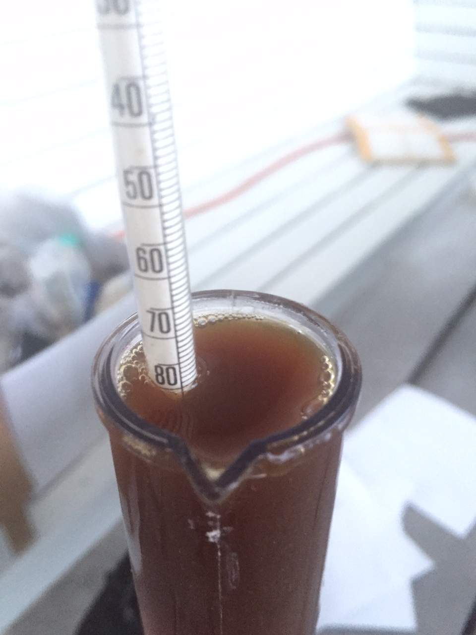 Speidelen sier at vi er ferdig med bryggen, og da stemmer det sikkert. En OG på 1.081 er akkurat der vi skulle være. Fargen var kanskje litt lysere enn det vi hadde tenkt, og slik vi husker NØ God Jul, men det står vi nok over.