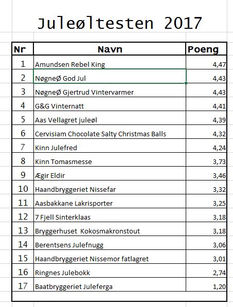 På tredjeplass finner vi en nykommer. Gjertruds Vintervarmer fra NøgneØ er den kommersielle utgaven av ølet som vant NM i Hjemmebrygging før i år. En dobbelbokk med godt maltpreg og sødme, noe alkoholpreg men innafor hos de fleste. Noen få tusendelers poeng foran Gjertrud finner vi årets andre deltager fra NøgneØ, klassikeren God Jul. Litt mer humle og brentpreg enn de fleste andre ølene i årets test, men med en fin fylde som balanserer fint.