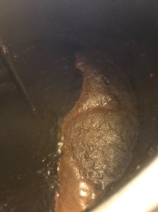 Kokingen tåkelegger hele vaskerommet. Åpner vi vinduet for mye så blir det iskaldt inne, og har vi vinduet lukket ser vi ikke en dritt på grunn av dampen. Bryggedillema! Nedi kjelen så ser det imidlertid veldig bra ut, deilig mørk farge.